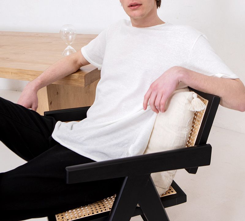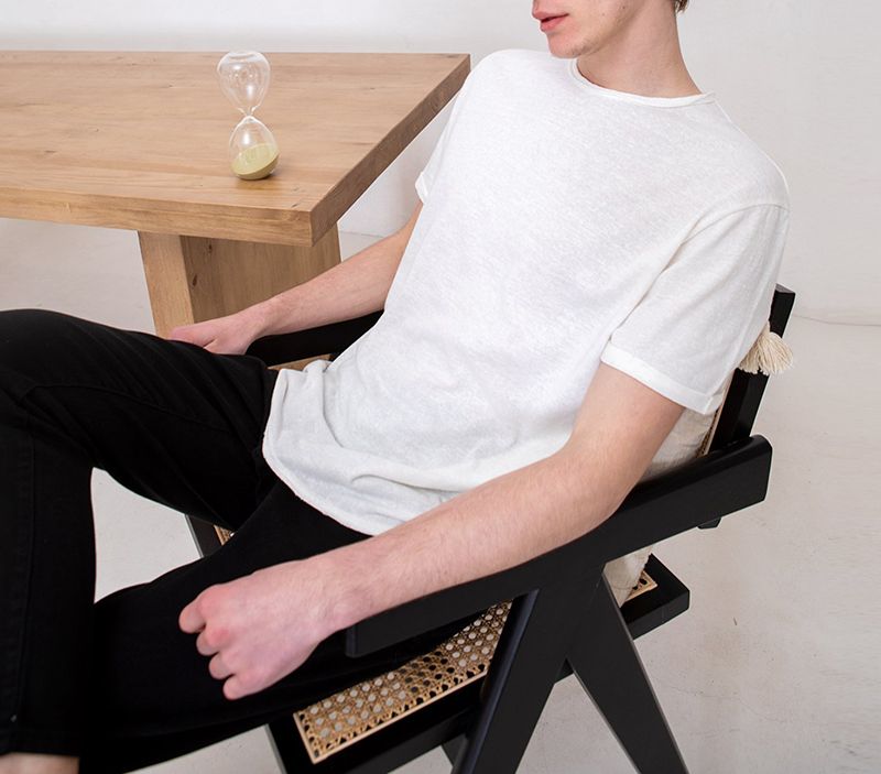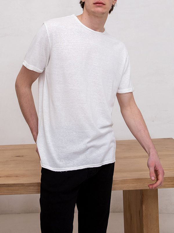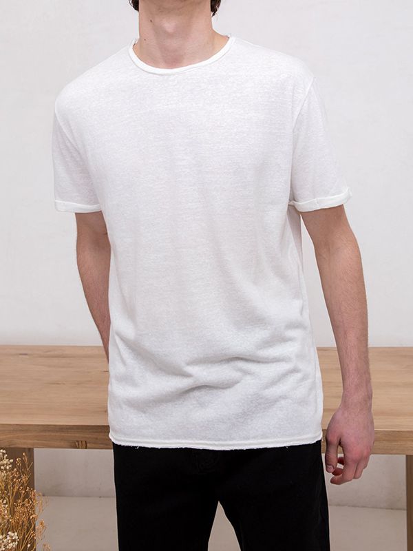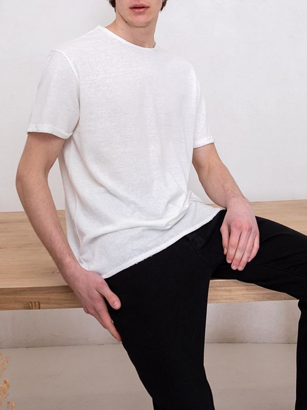Camiseta de hombre con tejido de algodón en color liso, con manga corta y cuello redondo. Bordes cortados con tijera para un estilo mas urban.