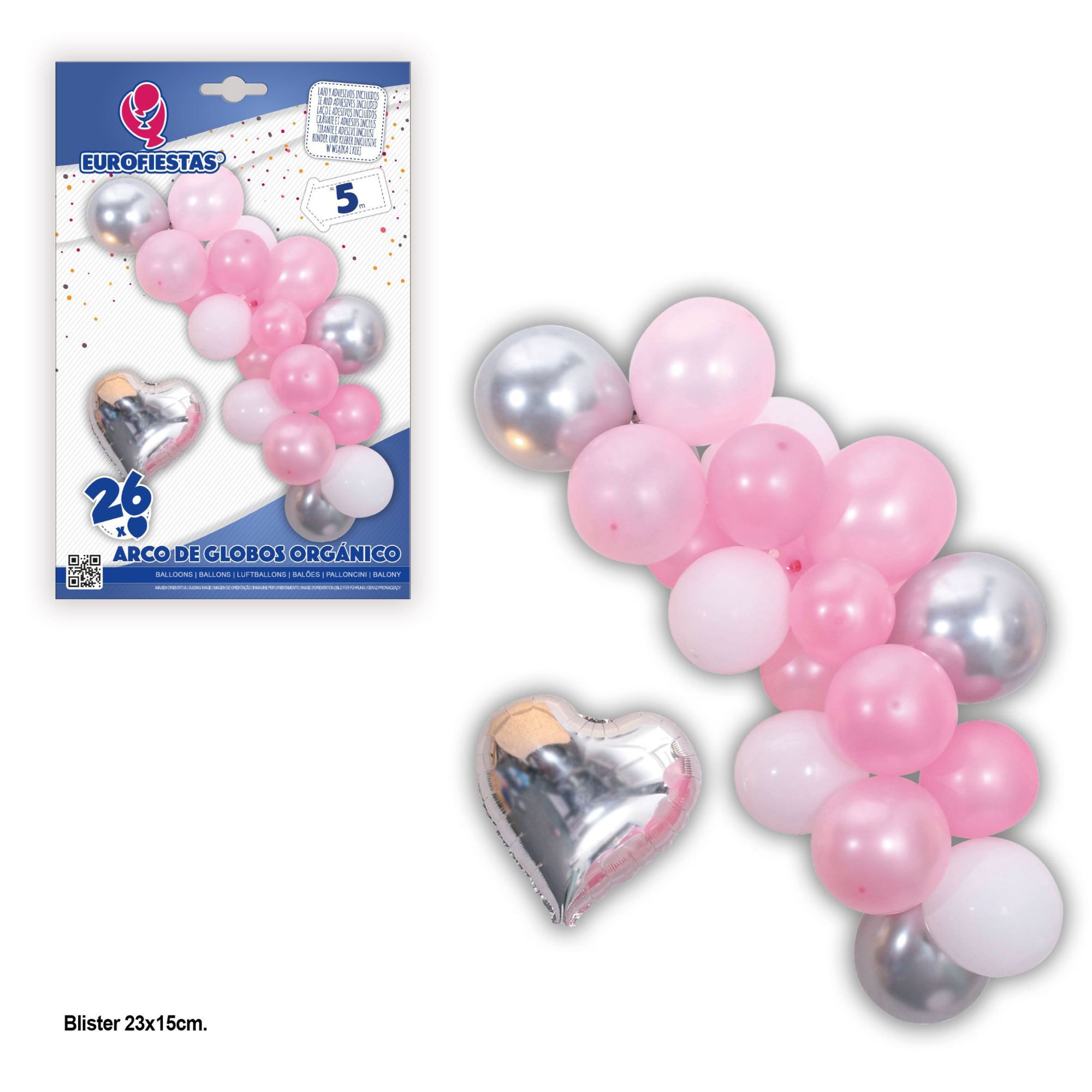 Contiene 26 globos en color rosa plata y un corazón plata de foil