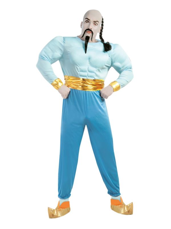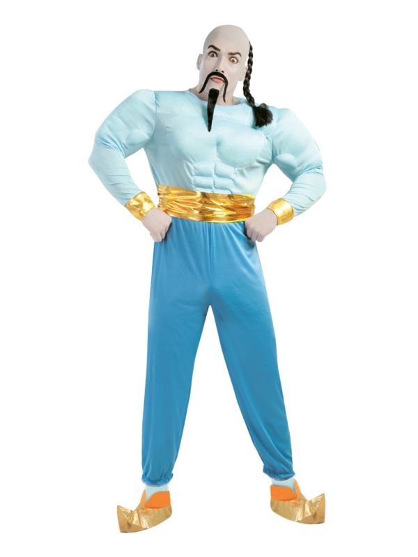 El disfraz de Genio de la lampara esta formado, por pantalón y camisa con musculos
