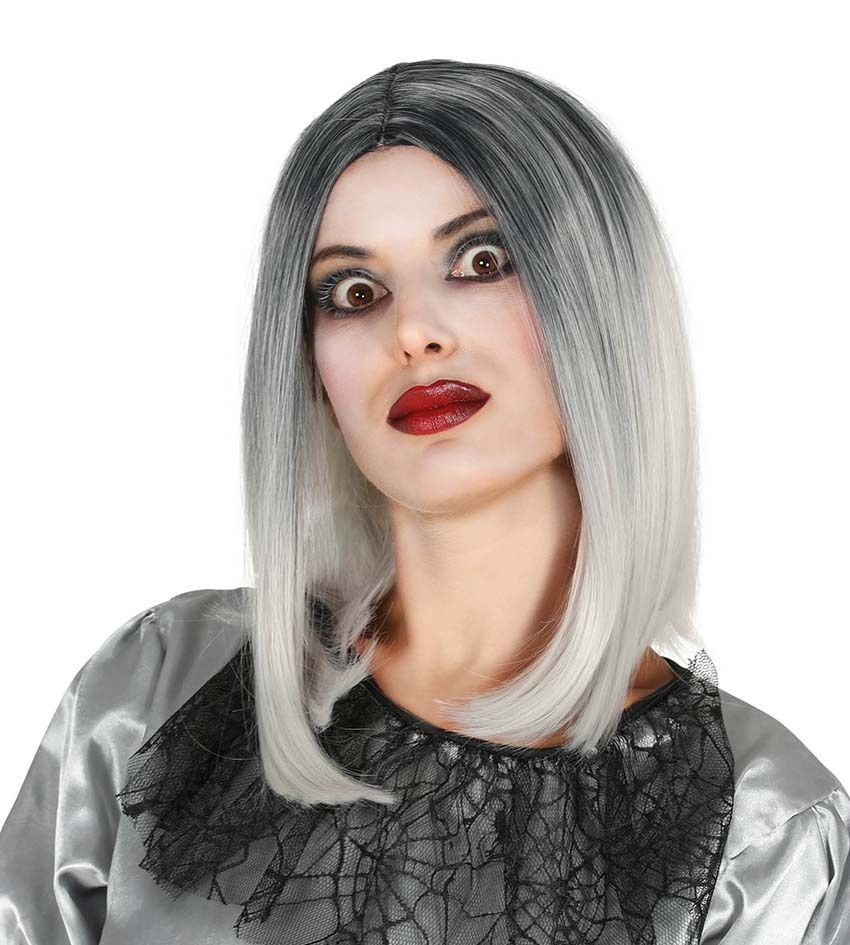 Complementa tu disfraz con esta peluca blanca y negra. Una peluca de calidad para que te sientas cómoda llevandola. Ideal para dar un toque más elegante a tu disfraz para halloween o para la fiesta de disfraces.