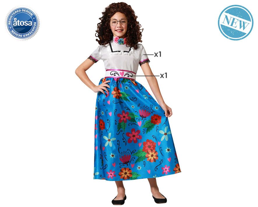 El disfraz de colombiana contiene vestido largo de manga corta y cinturón. Un disfraz original para disfrazar a las niñas en las fiestas de disfraces.