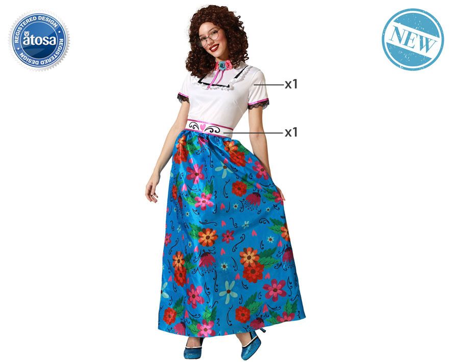 El disfraz de colombiana contiene vestido largo con manga corta y cinturón. Un disfraz cómodo y original para disfrazarte en tus fiestas de disfraces.