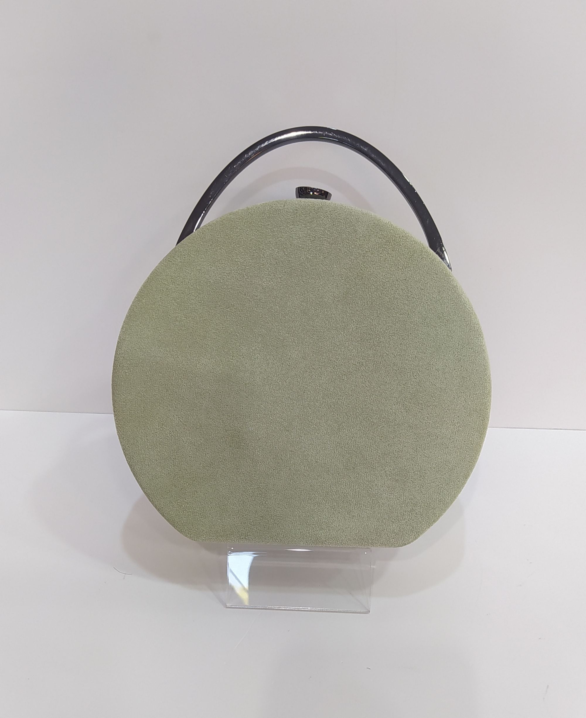 Bolso redondo de antelina con asa de metal plomo.