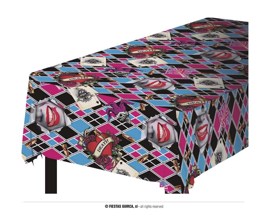 Decora la fiesta de cumpleaños con este original mantel de Harley Queen, ideal para fiestas de disfraces.