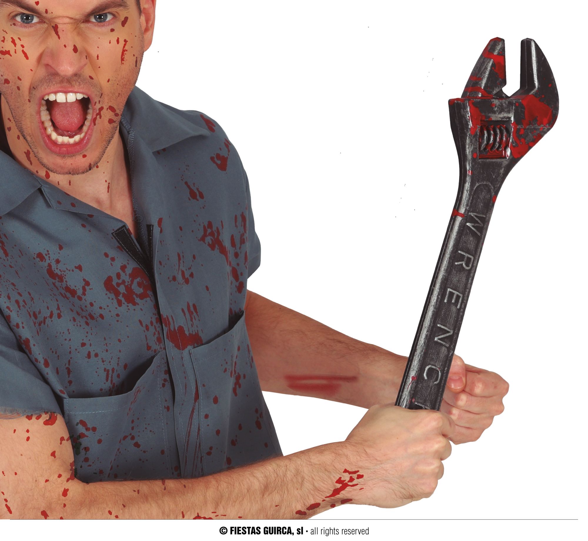 La llave inglesa contiene una llave inglesa manchada con sangre, ideal para complementar tus disfraces para Halloween.