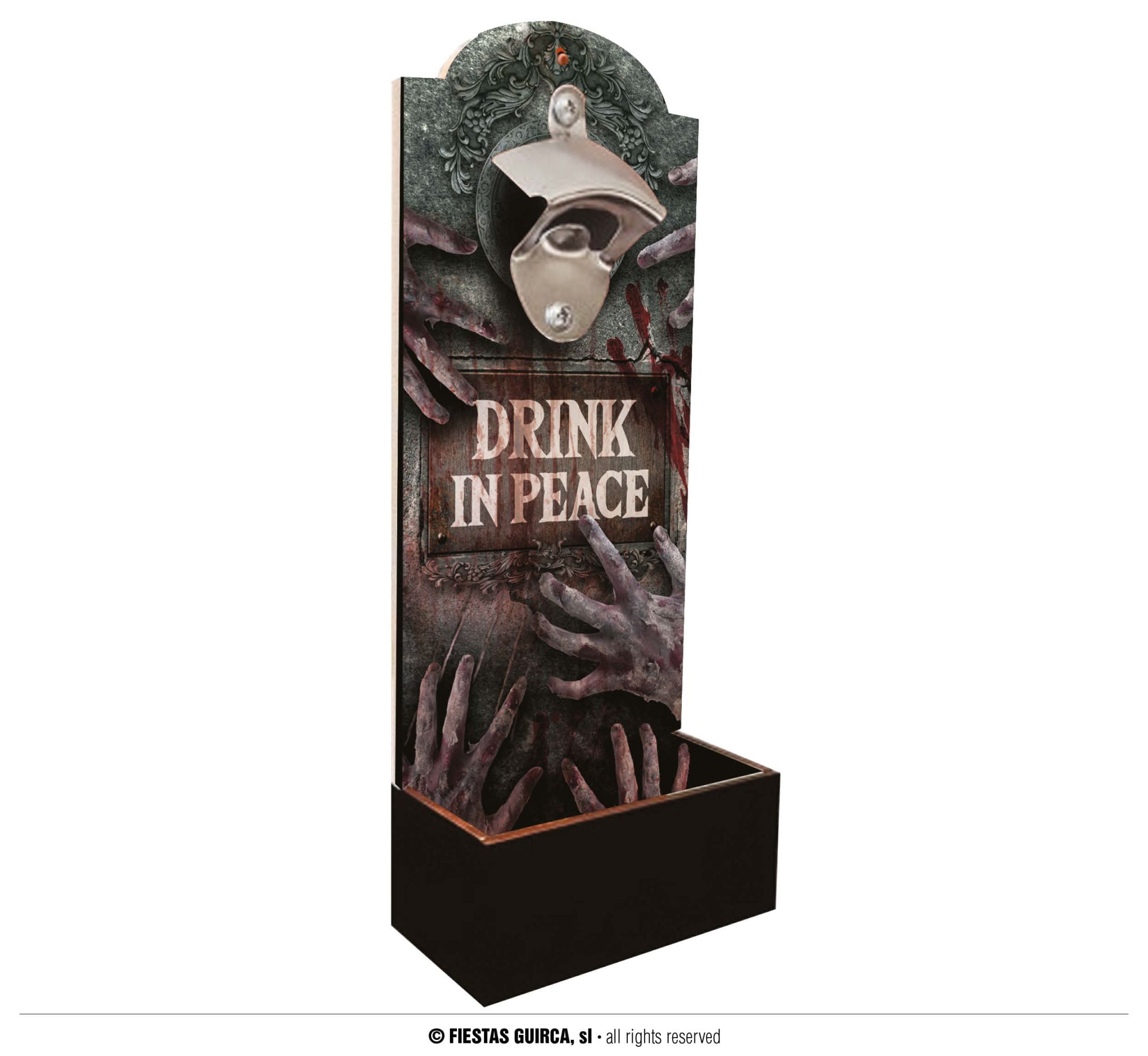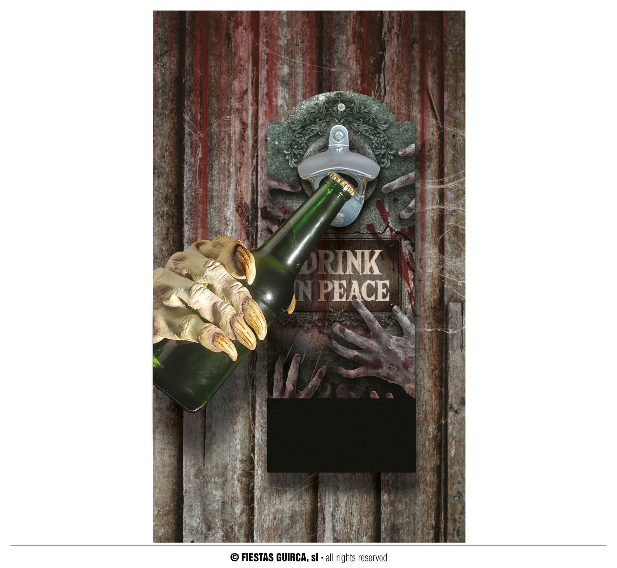 Un accesorios ideal para la noche de Halloween que no puede faltar en ninguna fiesta. El abrebotellas se puede anclar en la pared para abrir los botellines.