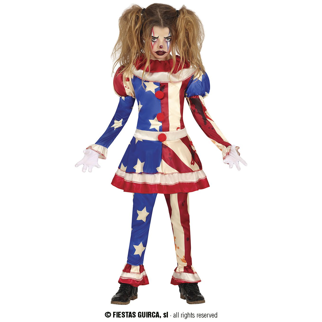 El disfraz de patriot clown para niña contiene camisa con cuello y pantalón. Gran variedad en disfraces para Halloween para niñas.