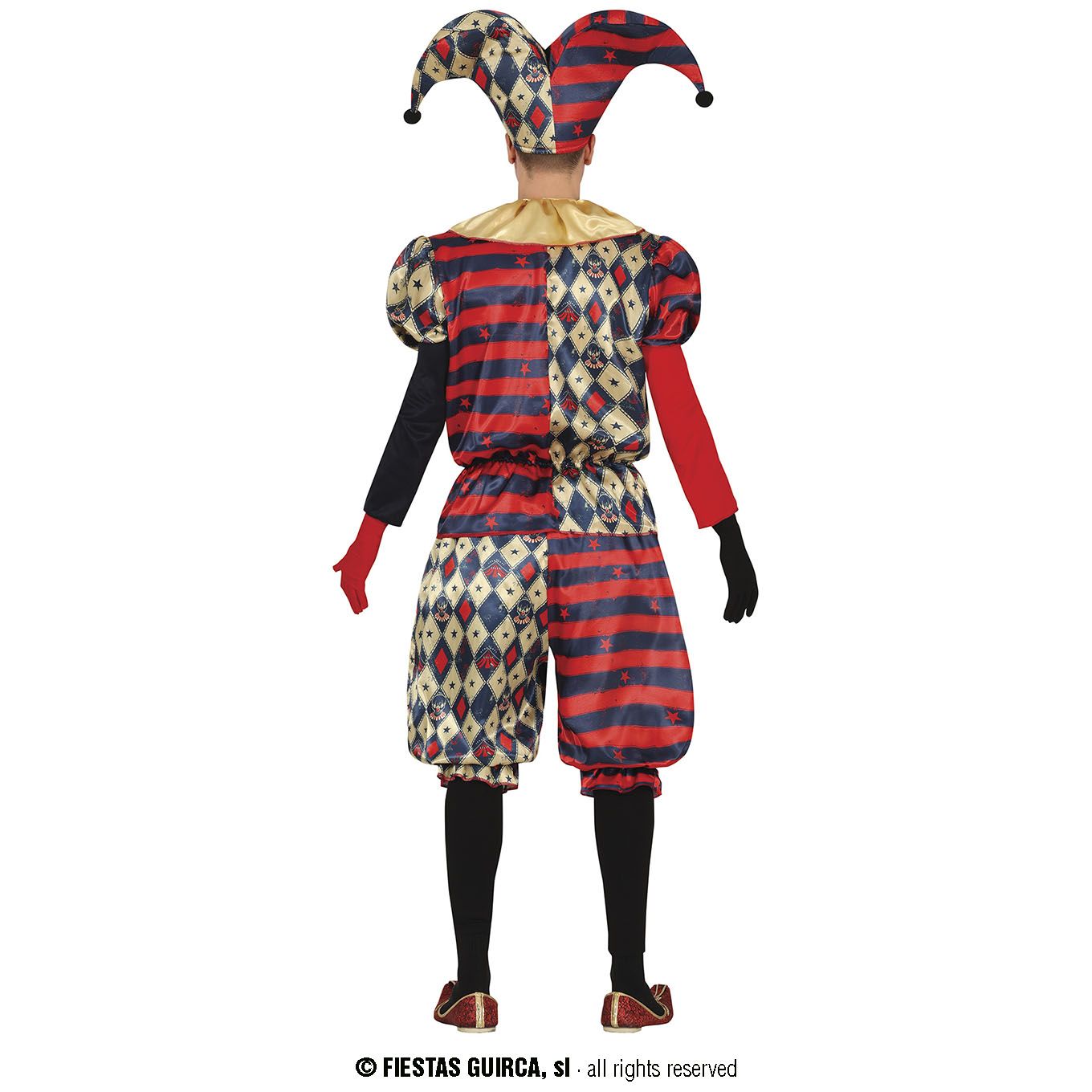 El disfraz de Arlequin para hombre contiene sombrero, cuello, camisa y pantalón. Un disfraz completo para disfrazarte en la noche de Halloween.