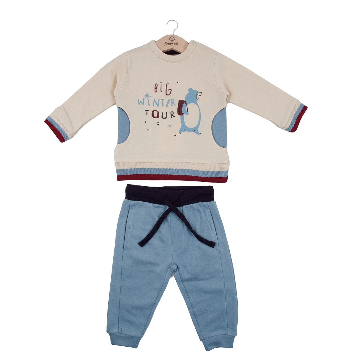 Chandal bebe compuesto por sudedera marfil con dibujo central y detalle de puños de colores y panatlón en azul con cinturilla de goma.