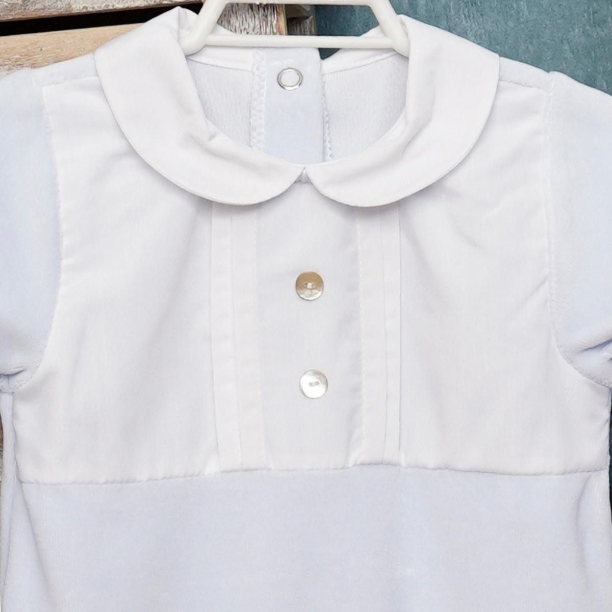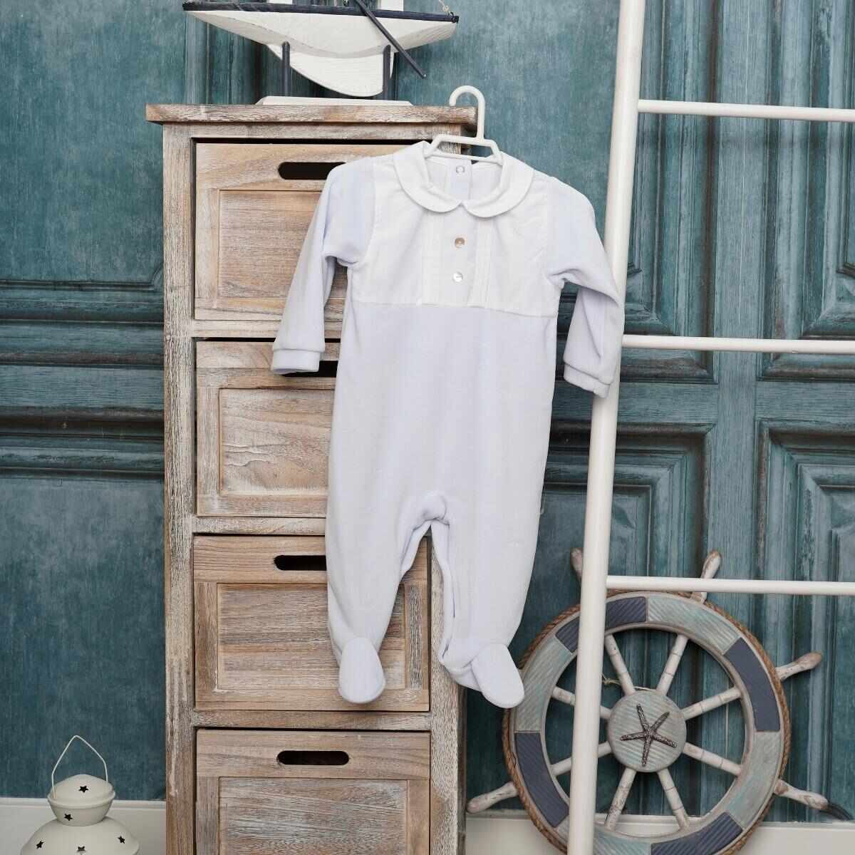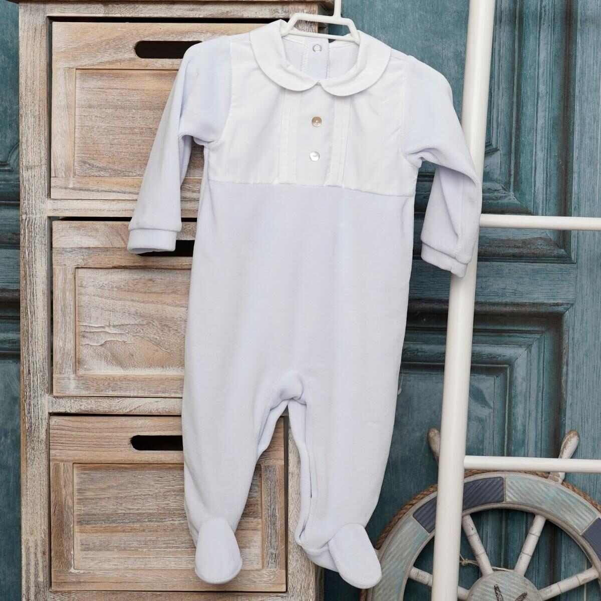 Pelele bebe en terciopelo celeste con detalles de tels blanca haciendo tablas. Cuello bebe en blanco.