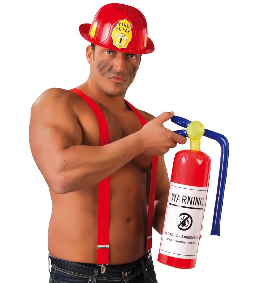 El extintor hinchable contiene un extintor rojo para complementar tu disfraz de bombero