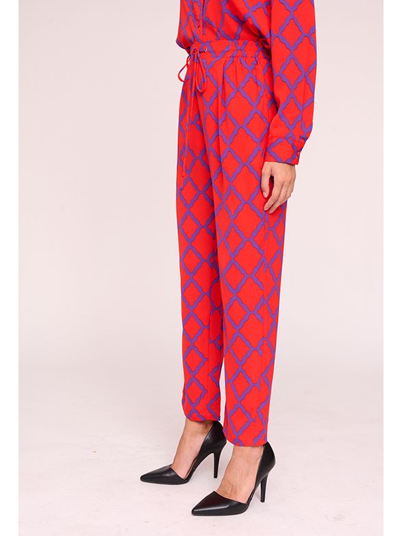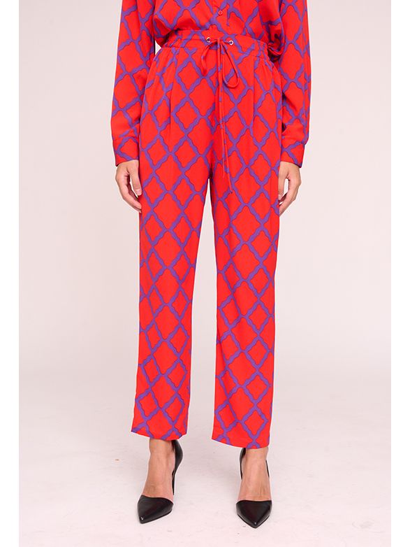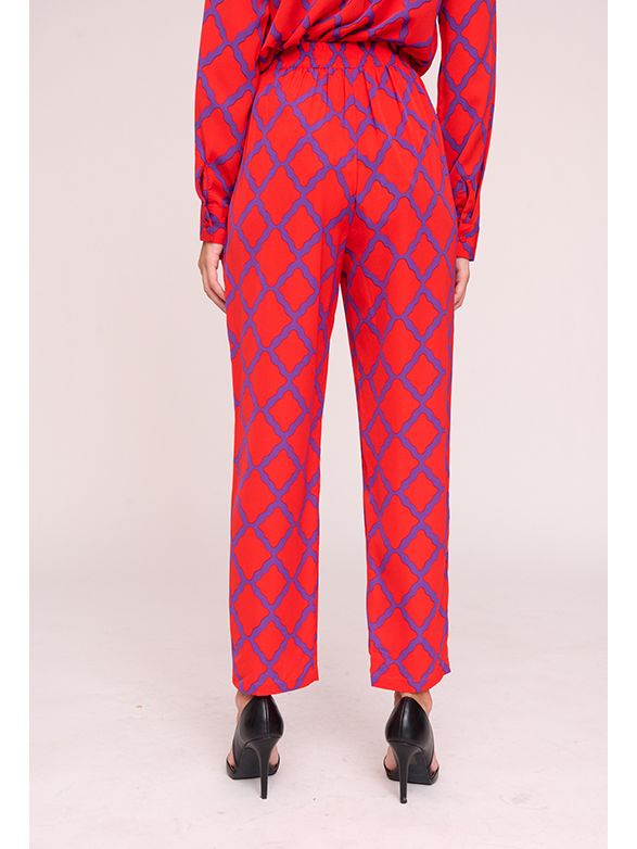 Pantalón recto de tejido fluido con estampado de rombos en color morado, con pinzas delanteras, goma en la cintura y bolsillos laterales.