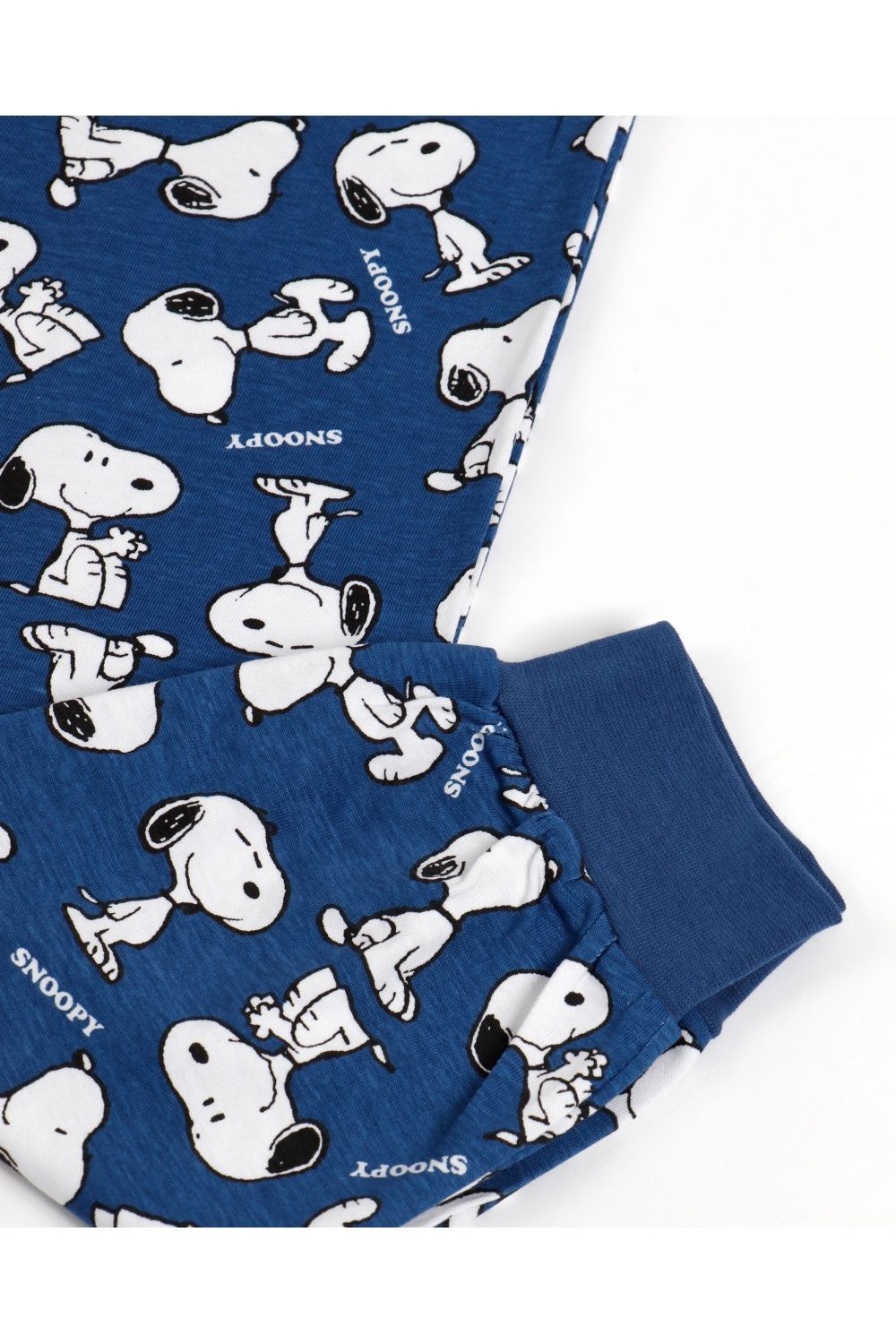 Pijama de punto de algodón, de manga larga, cuello redondo y pantalón largo. Camiseta de tejido felpa (tejido tipo chandal) blanca, con aplique bordado de Snoopy tumbado encima de su casa personalizada de la marca Peanuts. Pantalón de punto en azul estampado de multiples Snoopy con cinturilla ajustable y puños. Tejido suave al tacto.