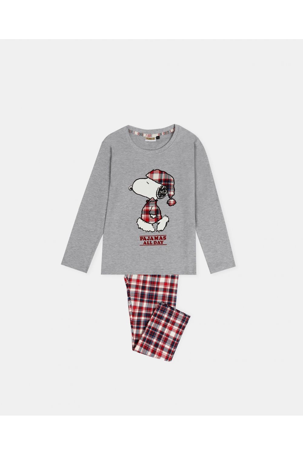 Pijama de punto de algodón, de manga larga, cuello redondo y pantalón largo. Camiseta de punto interlock vigoréen gris, con dibujo central de Snoopy, personalizada de la marca Peanuts. Pantalón de punto estampado en cuadros con cinturilla ajustable. Tejido suave al tacto.
