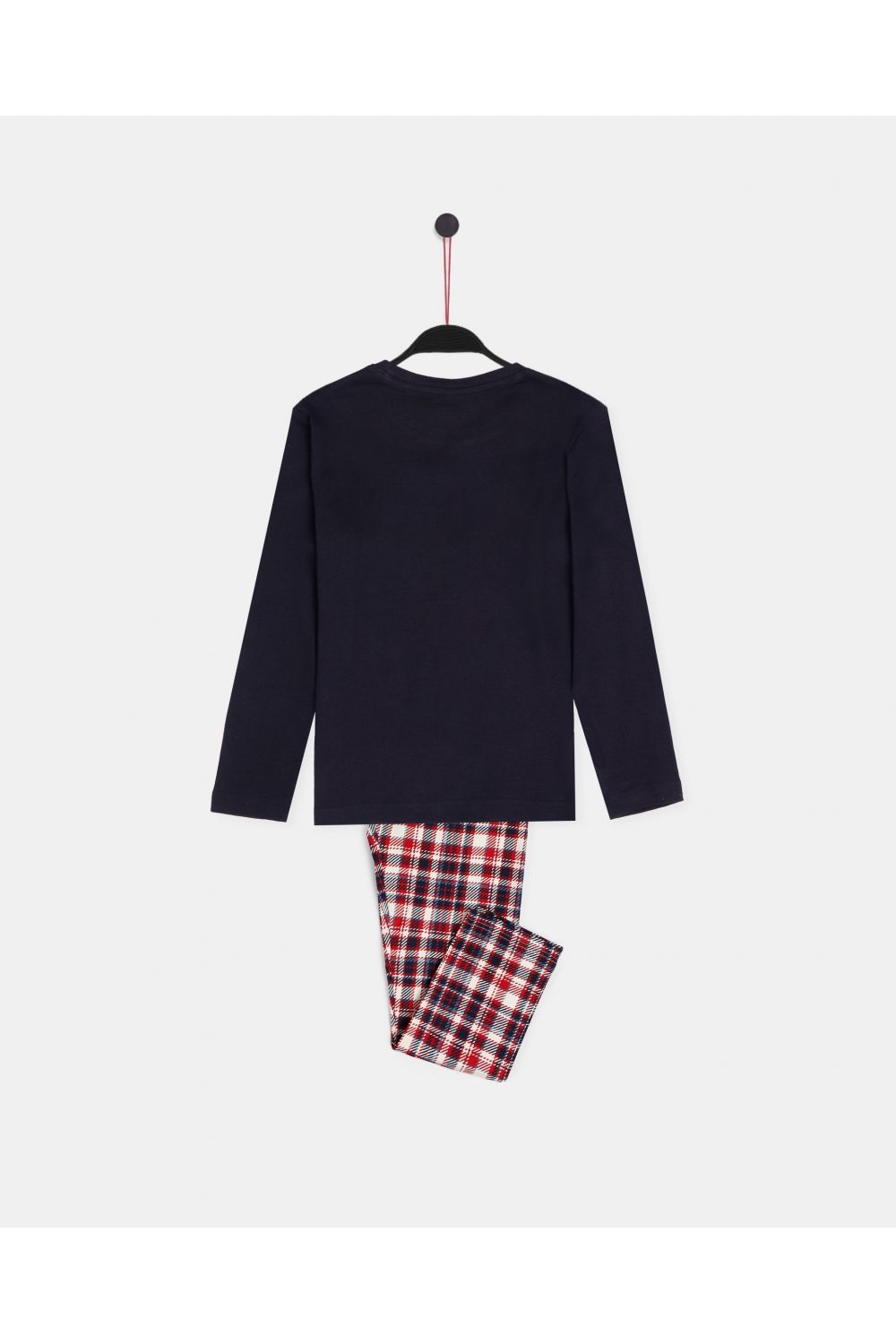 Pijama de punto de algodón, de manga larga, cuello redondo y pantalón largo. Camiseta de punto interlock vigoré en marino con dibujo central de Snoopy, personalizada de la marca Peanuts. Pantalón de punto estampado en cuadros con cinturilla ajustable. Tejido suave al tacto.