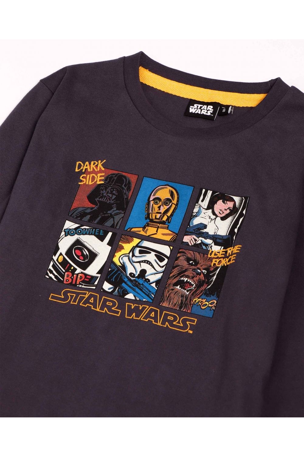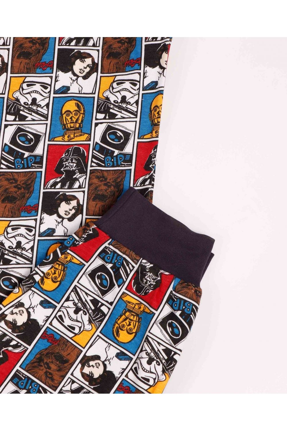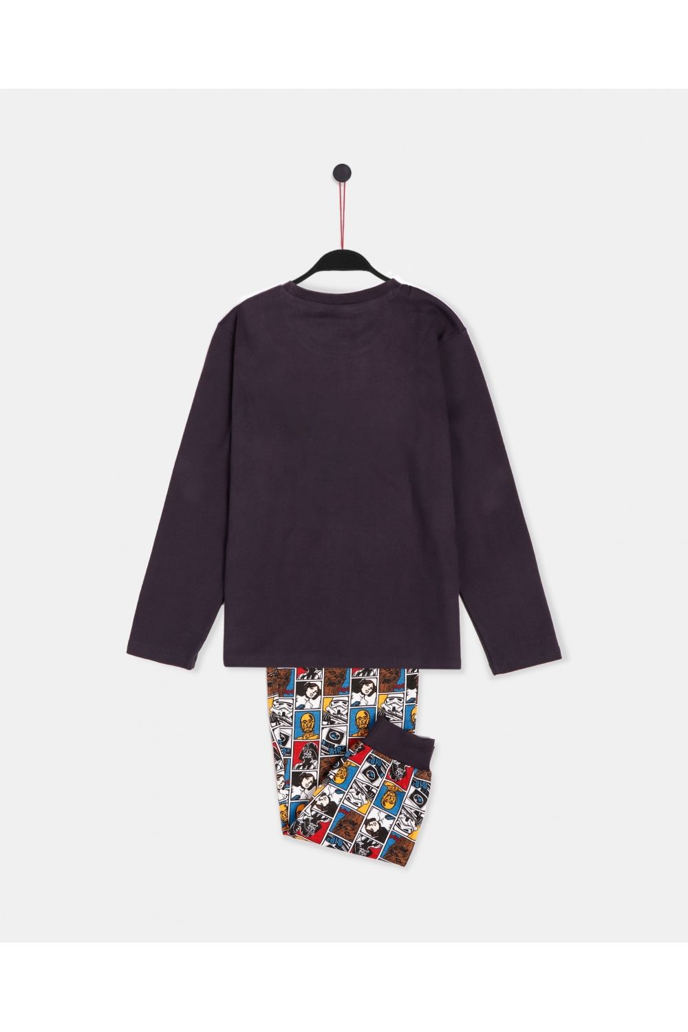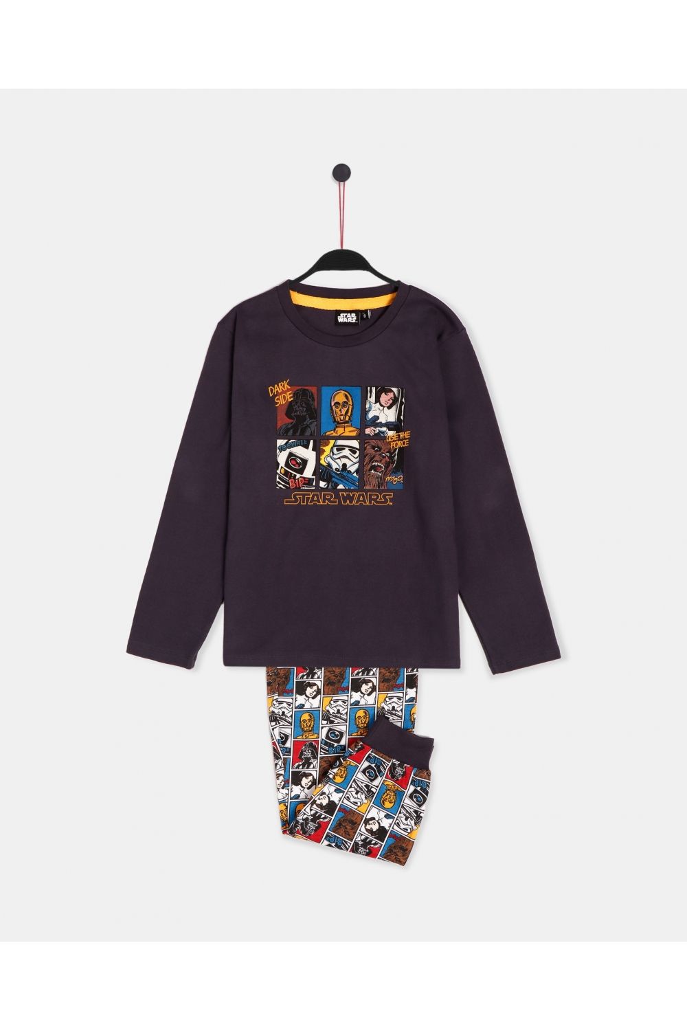 Pijama de punto de algodón, de manga larga, cuello redondo y pantalón largo.Camiseta de punto liso, de color marengo, con dibujo estampado central, personalizada de la marca Star Wars. Pantalón de punto estampado con los personajes de Star Wars con cinturilla ajustable y puños. Tejido suave al tacto.