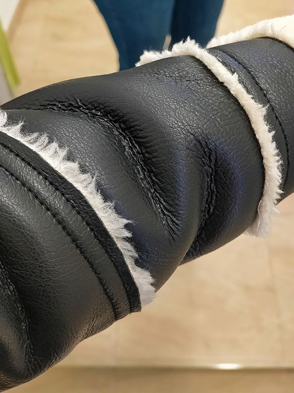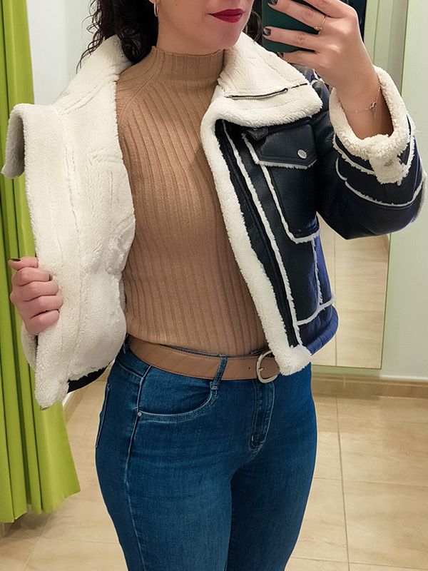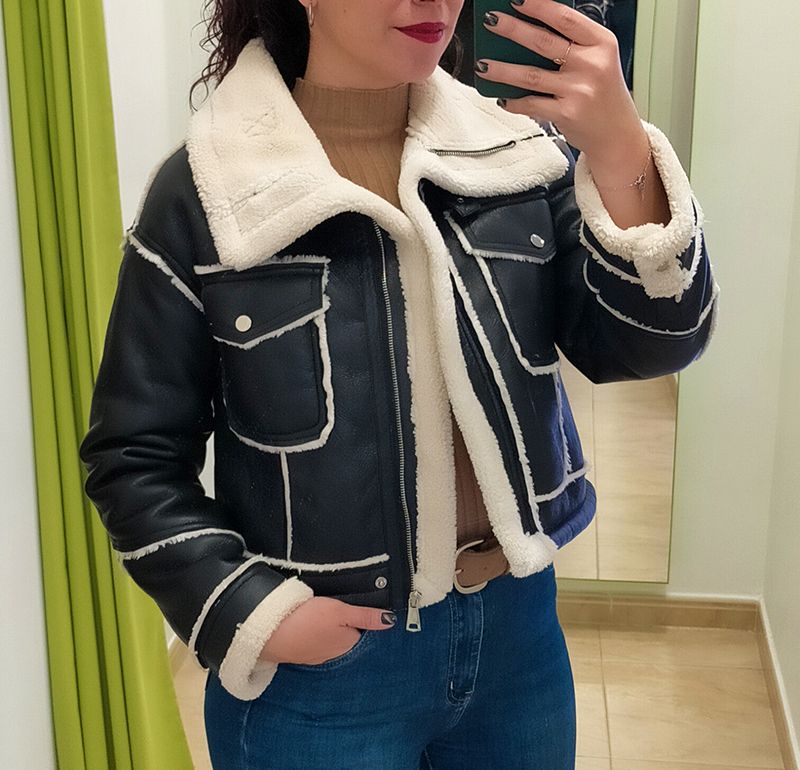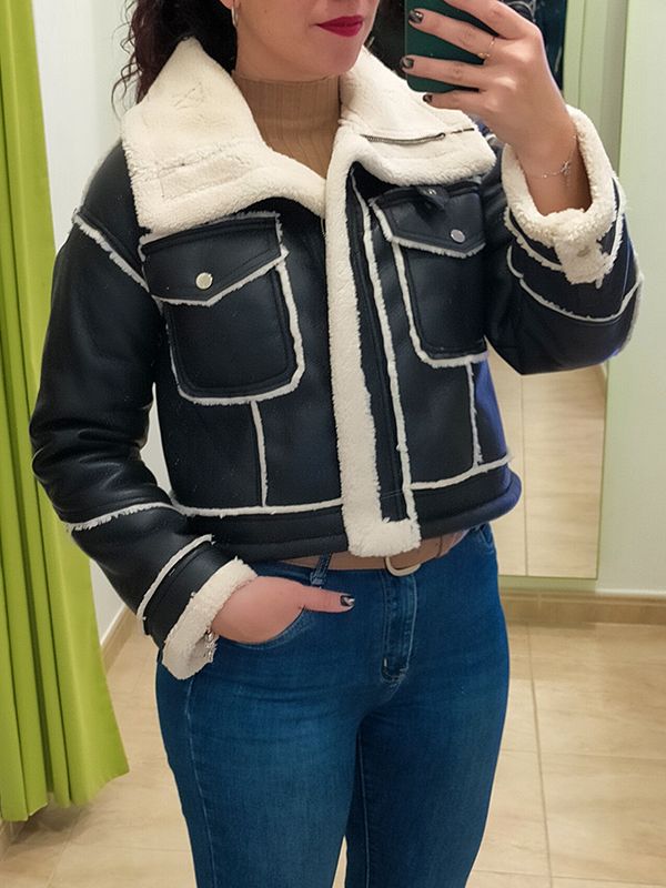Chaqueta tipo aviador completamente forrada con borrego blanco, cuellos solapa grandes con hebillas y bolsillos camiseros en la parte delantera.