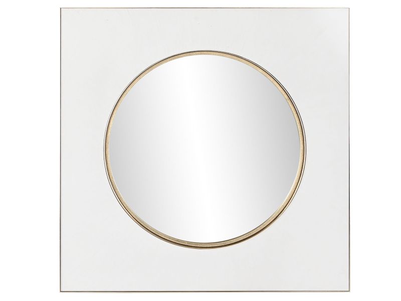 Espejo redondo enmarcado con fina moldura oro y tablero en blanco con textura.