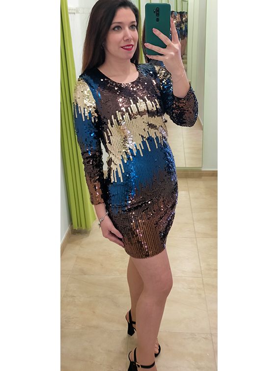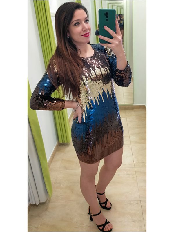 Vestido corto con lentejuelas en cobre, oro y azulón haciendo degradado, con manga larga y cuello redondo. Vestido completamente forrado.