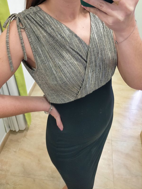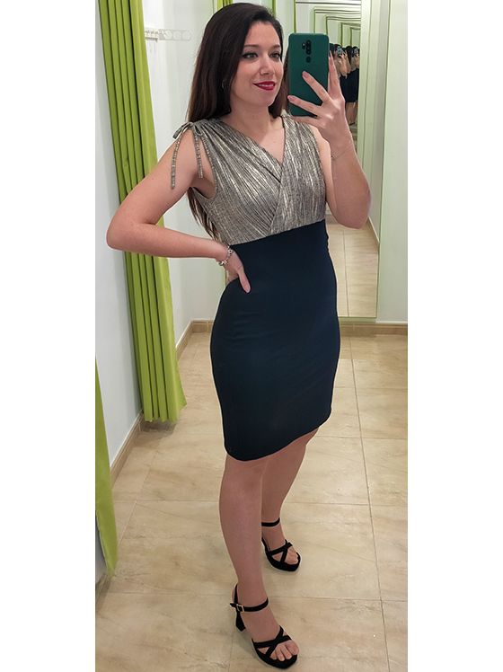 Vestido corto con falda ajustada de punto y parte de arriba cruzada de tejido de punto fino con hilo metalizado en dorado y tirantes anchos ajustables con lazada.