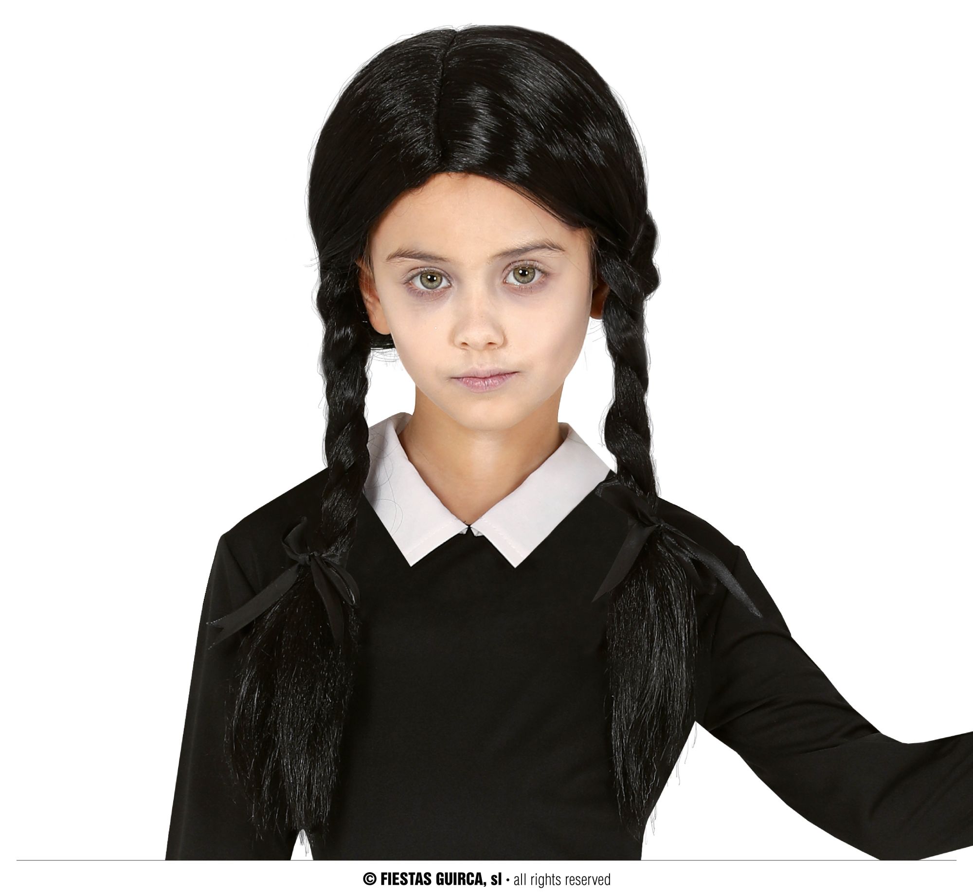La peluca con trenzas infantil contiene una peluca con trenzas de color negro para complementar el disfraz de miércoles infantil.