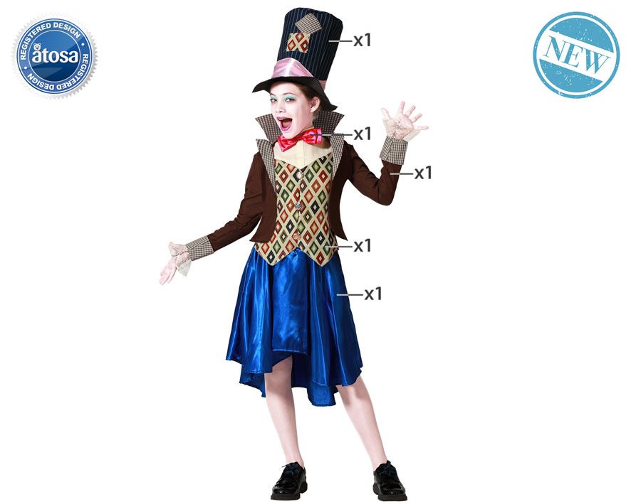 El disfraz de sombrerera loca contiene sombrero de copa, chaqueta, pajarita, falda y chaleco. Disfraces originales para niños y niñas para disfrazarse en carnaval.