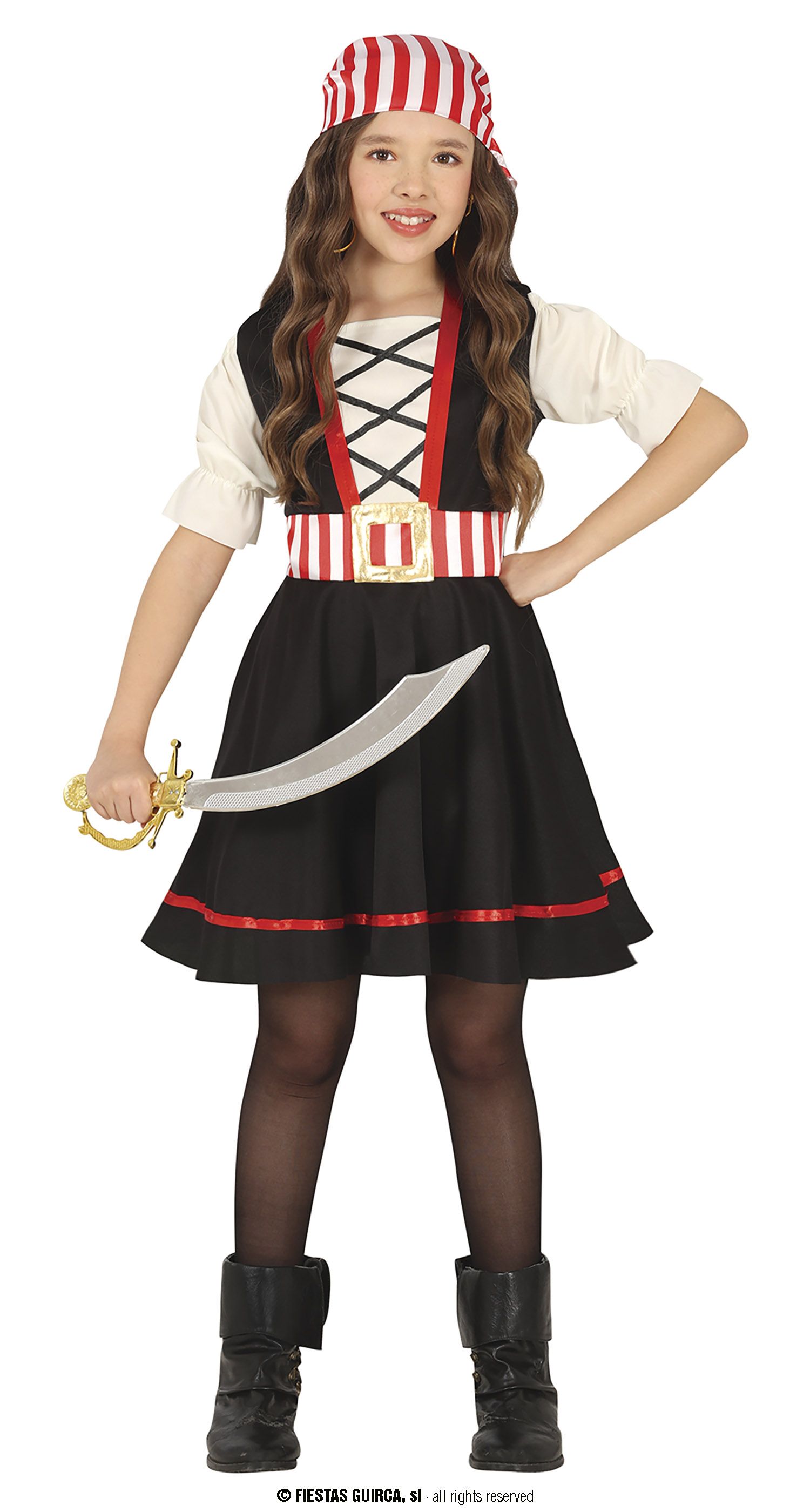 El disfraz de pirata para niña contiene vestido, pañuelo y cinturón.