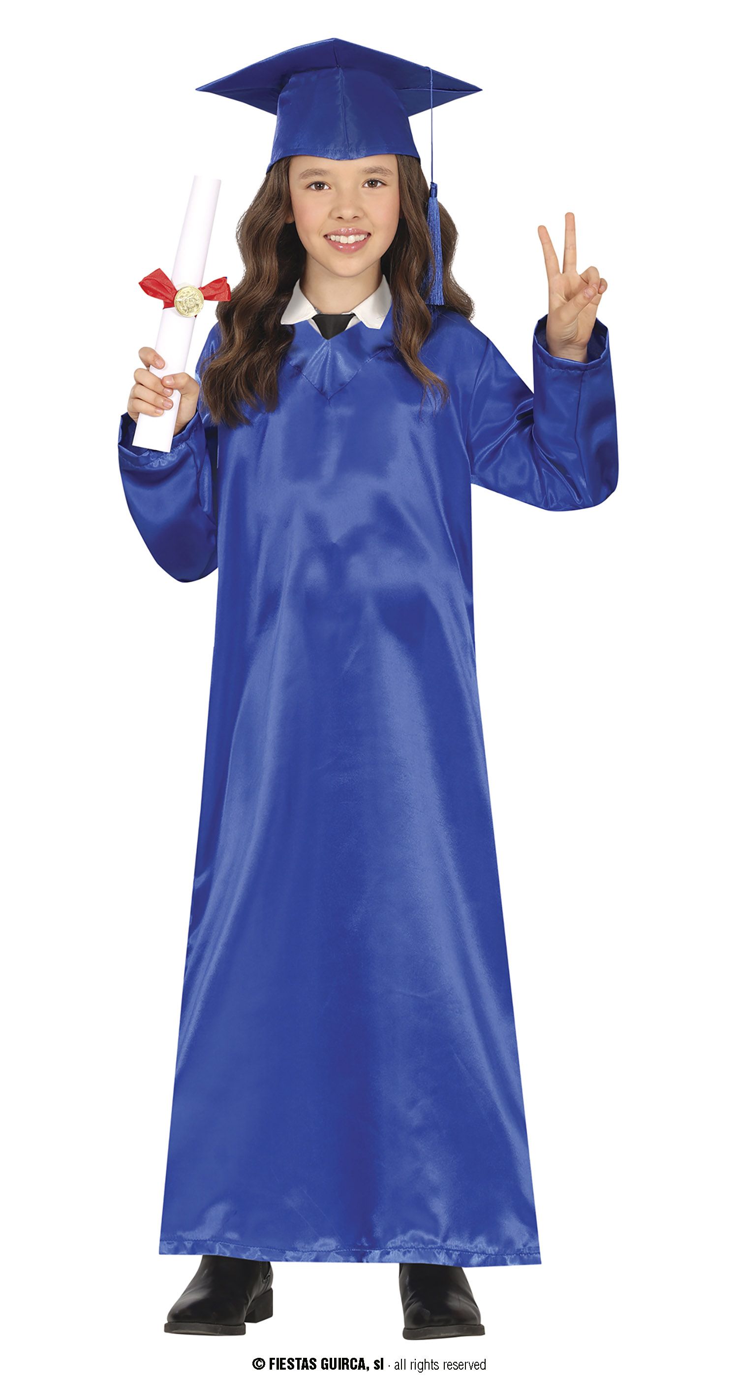 El disfraz de graduado azul contiene, una toga de color y birrete del mismo color. Togas para graduación infantiles, ideal para las graduaciones de los niños.
