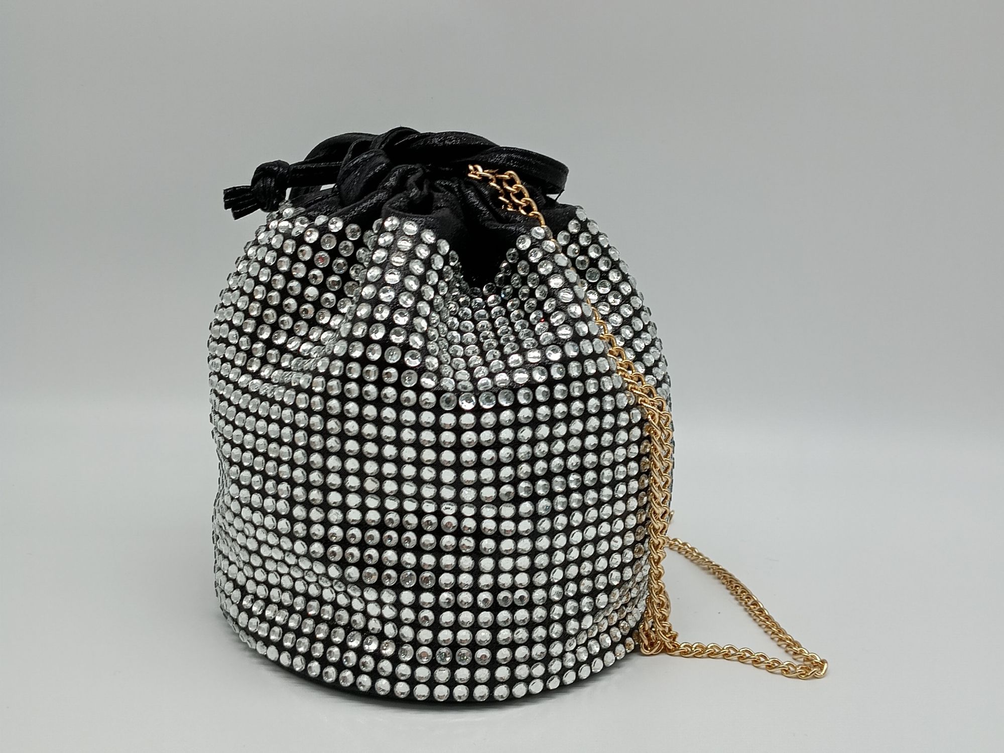 Bolso bombonera negra con brillantes . Cadena dorada en el interior .