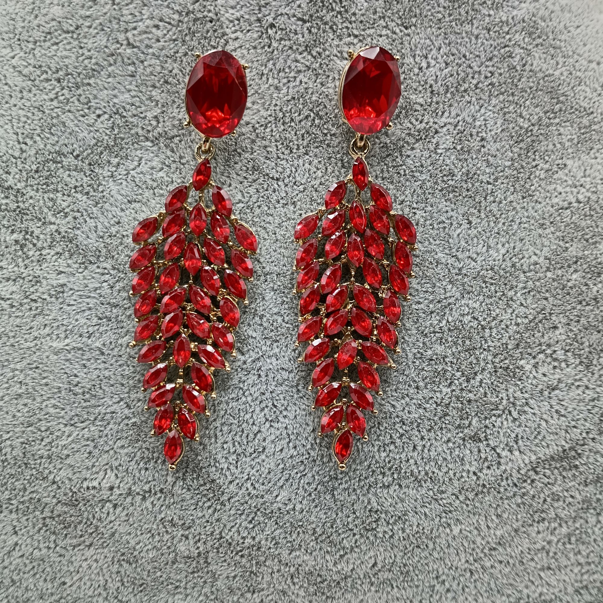 Pendientes rojos con fondo dorado, largos montado con cristales en forma de racimo.