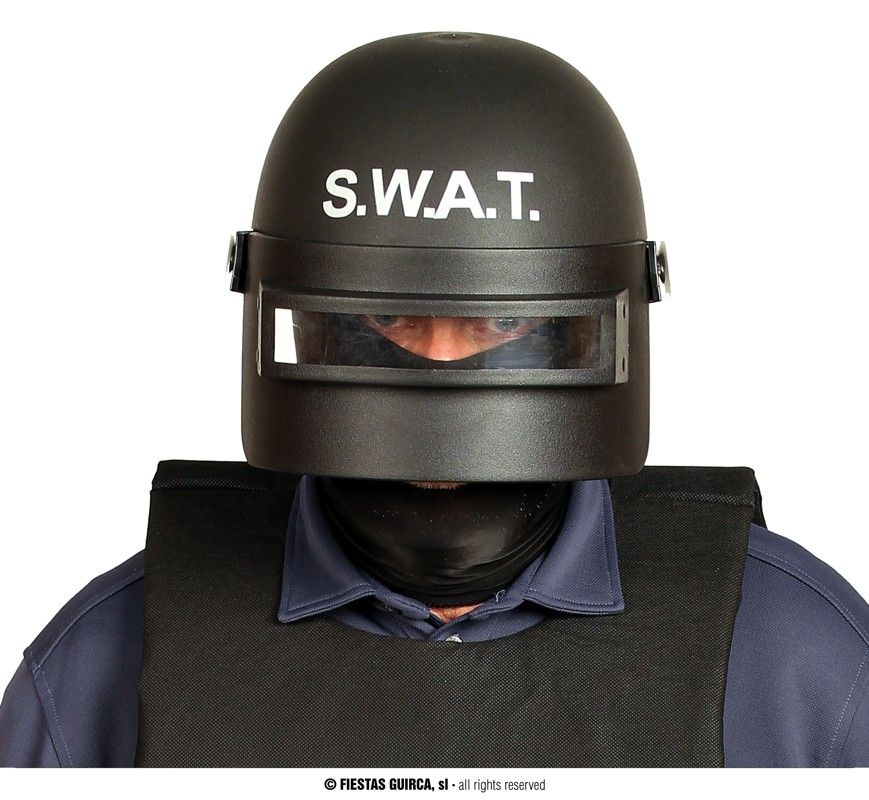 Complementa tu disfraz de Swat con este este casco de plástico, ideal para que no te falte detalle a tu disfraz. Un casco para adulto o para niños mayores de 14 años.