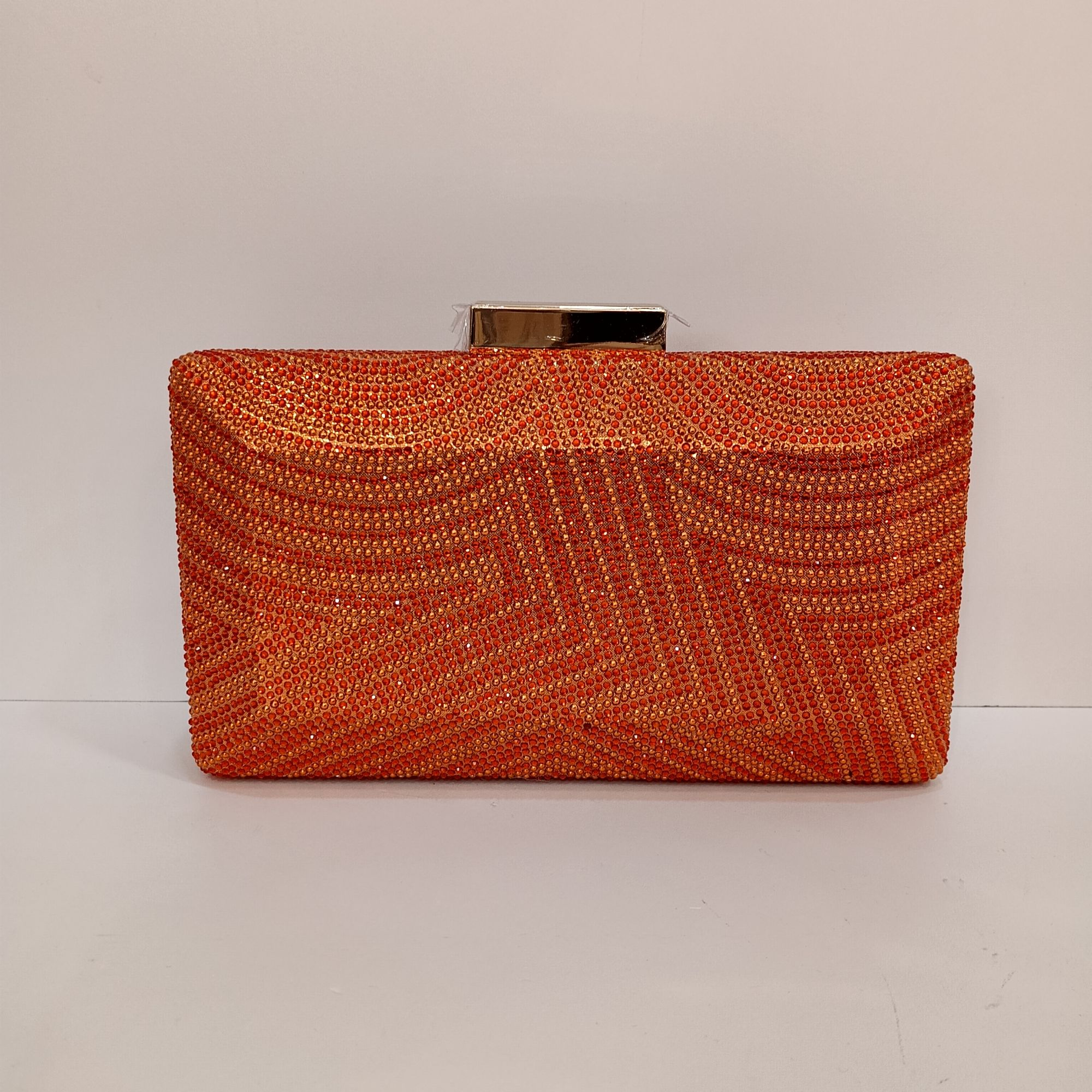 Bolso naranja con brillantes haciendo dibujos por las dos caras . Cadena en el interior dorada.