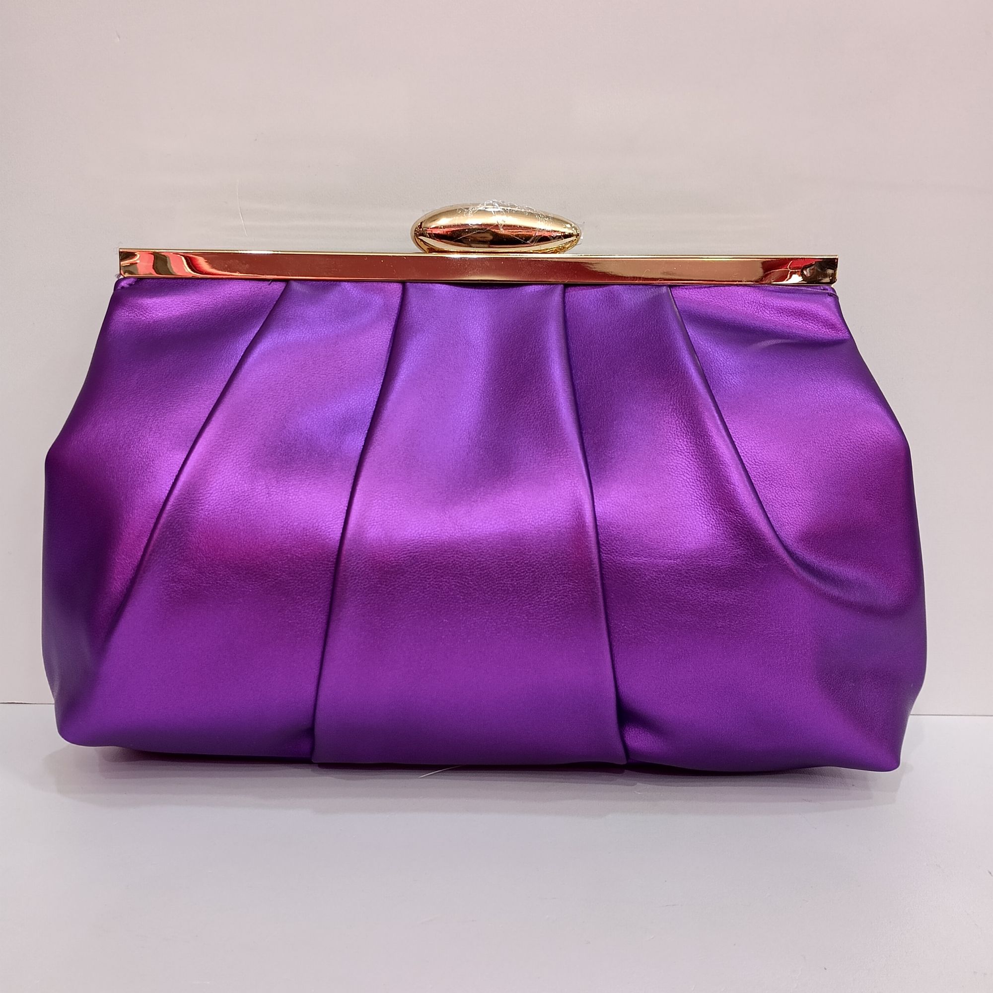 Bolso morado de polipiel con broche y cadena dorada . Pliegue en la parte de lantera y liso en la trasera.