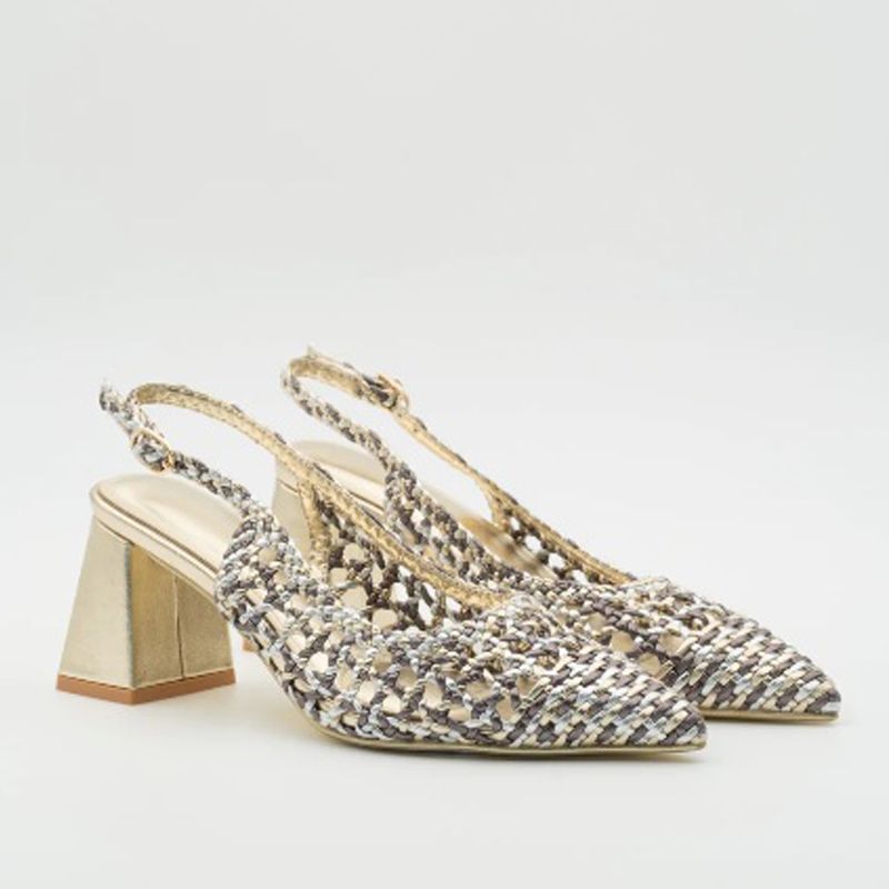 Zapato de rejilla trenzada en color oro, plata y cobre, con puntera reforzada y talón abierto. El tacón es cuadrado en color oro y tiene la plantilla confort con almohadilla en la parte del talón y metatarso.