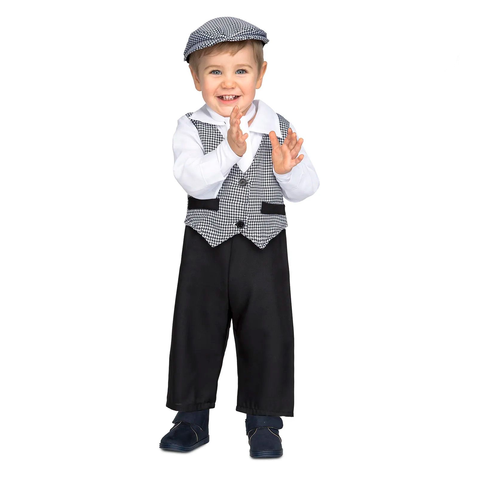 El traje de Chulapo para bebe contiene mono con chaleco y gorra.