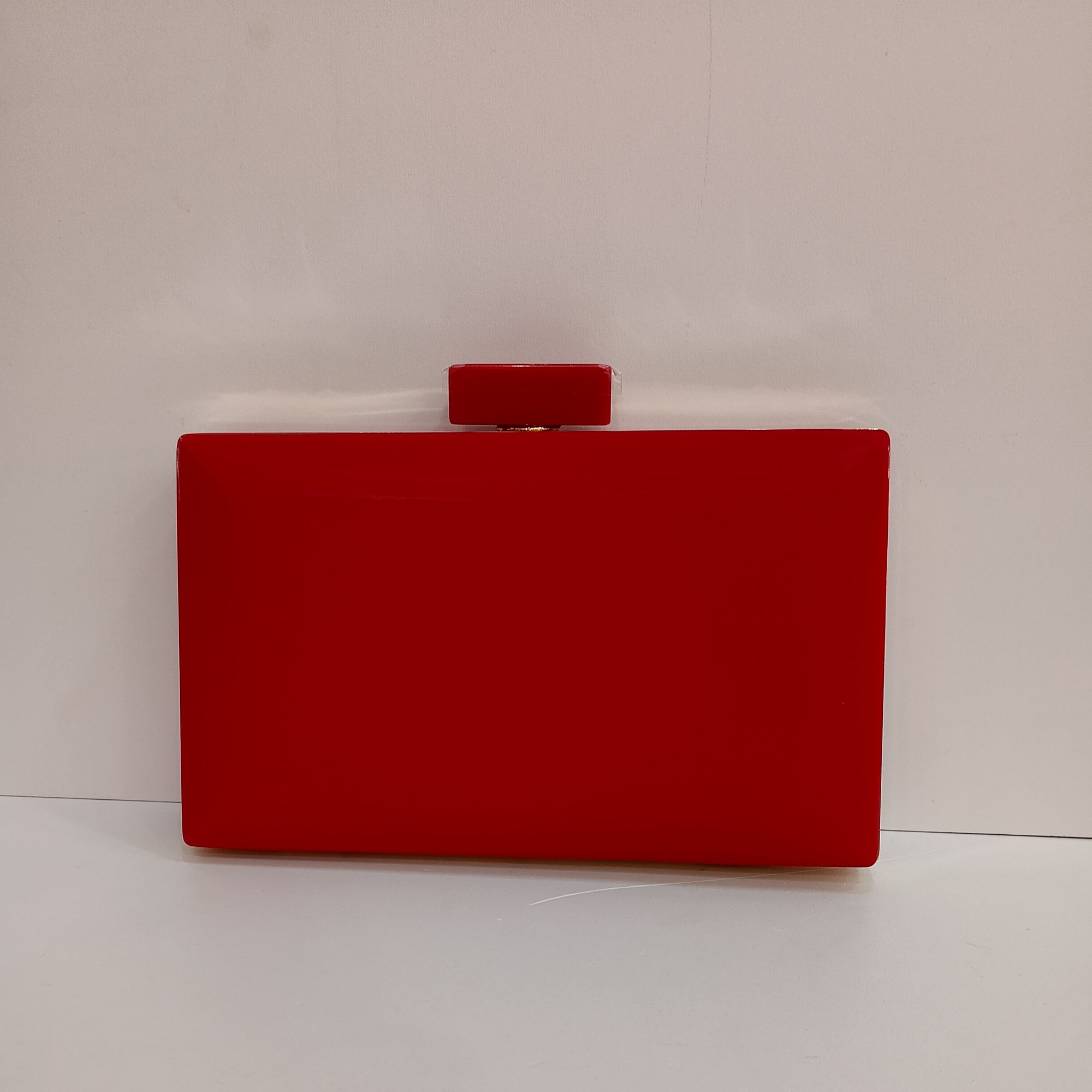 Bolso rojo acharolado rectangular con revorde en dorado y cierre efecto pie