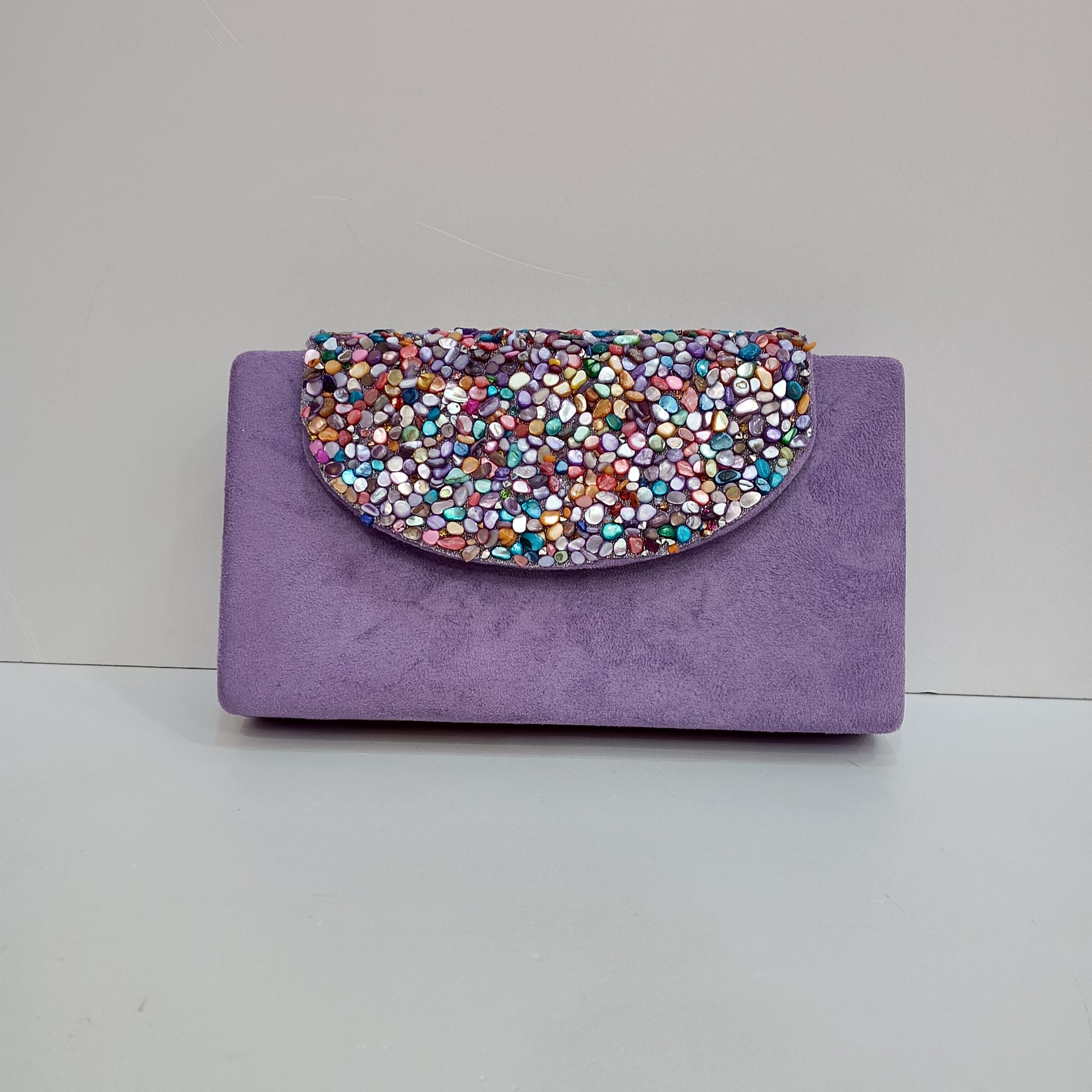Bolso lila de ante con solapa de piedras en multicolores, y cadena en el interior dorada.