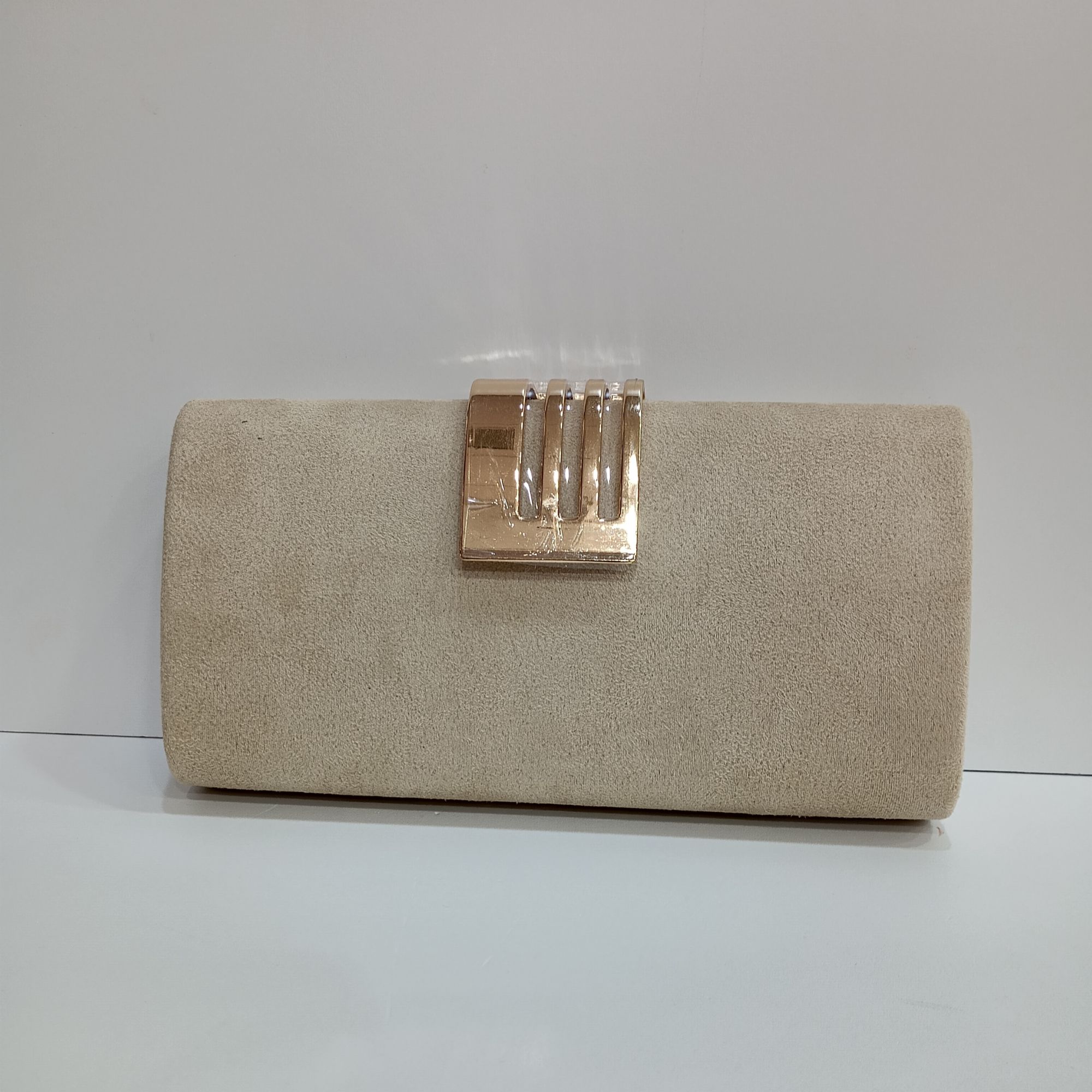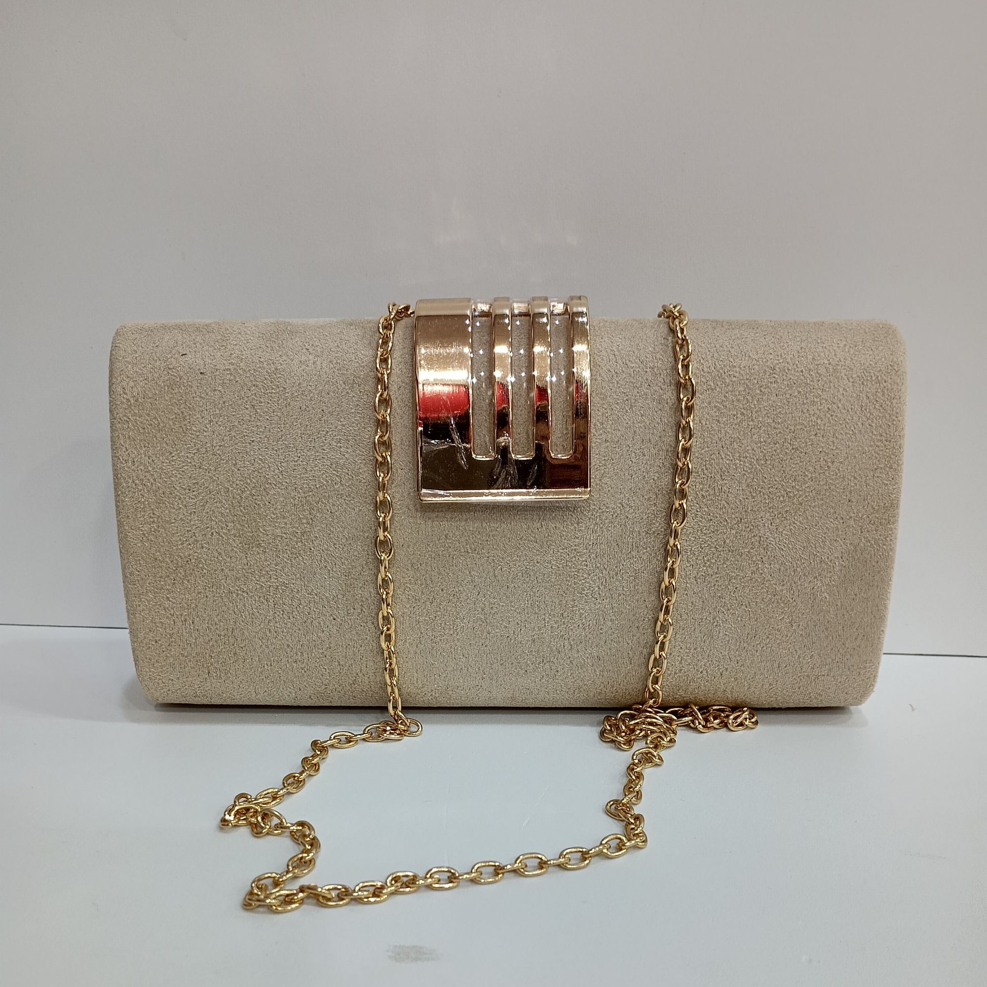 Bolso beige de antelina con brochemetal dorado . Cadena dorada en el interior.