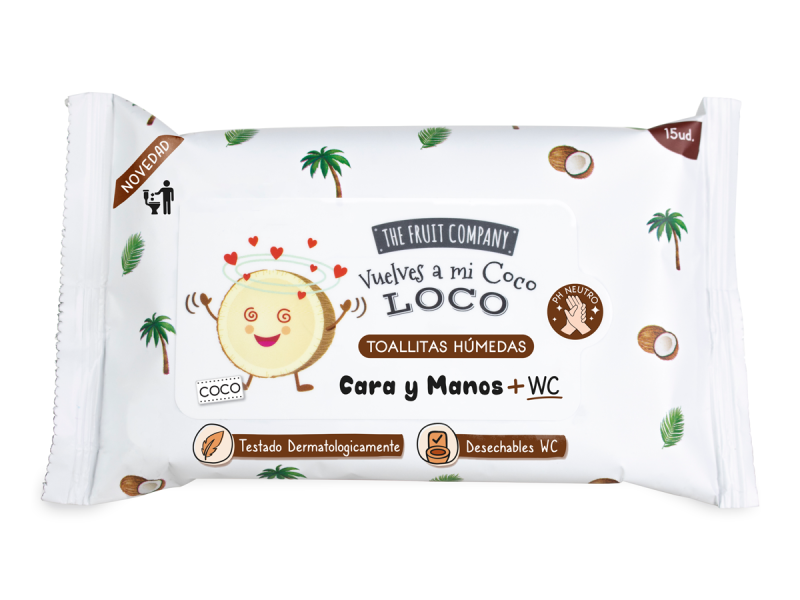 Paquete de 15 toallitas hidroalcohólicas de Coco de The Fruit Company para cara, manos y WC.