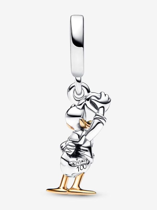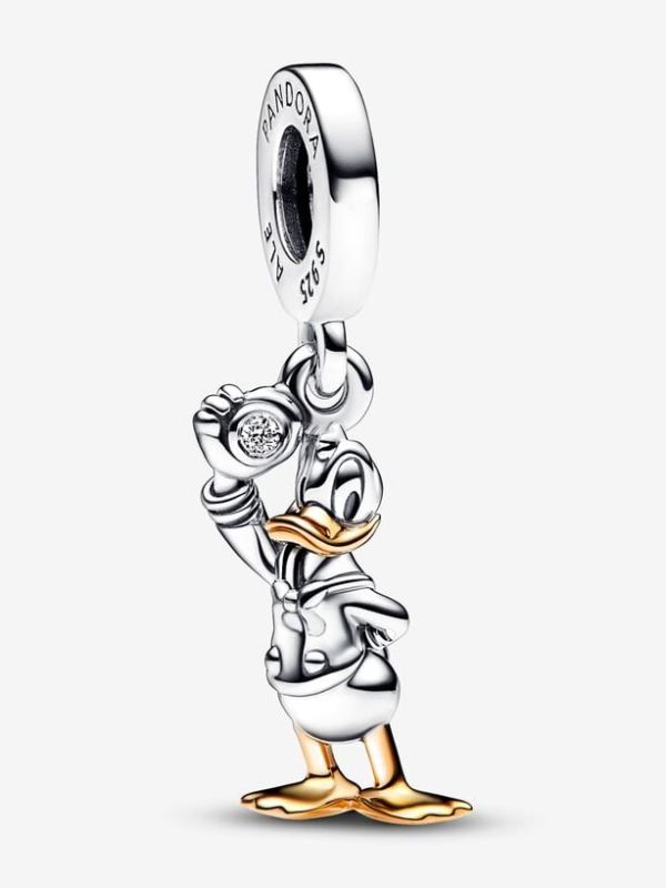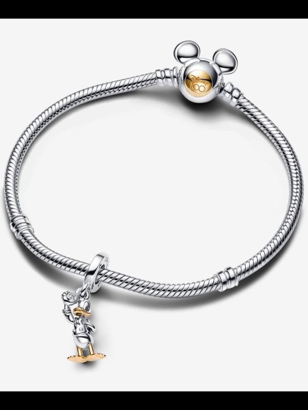 Para el amante incondicional de Disney: colecciona nuestro Charm Colgante Pato Donald 100 Aniversario de Disney y rinde un homenaje a uno de los personajes más icónicos de Disney. Vestido con su clásica camisa marinera, el Pato Donald se presenta acabado a mano en plata de primera ley con detalles de oro de segunda ley de 14k en el pico y la patas. Ejecutando una alegre pose, Donald levanta su gorra de su marinero para revelar un refulgente diamante sintético con talla brillante de 0.009 ct TW GHI SI1 engastado en bisel. Para conmemorar 100 años de magia, el lateral se ha decorado con la inscripción "Disney 100". Agrégalo a tu colección como un alegre recordatorio de mirar el lado brillante de la vida y reír todos los días.