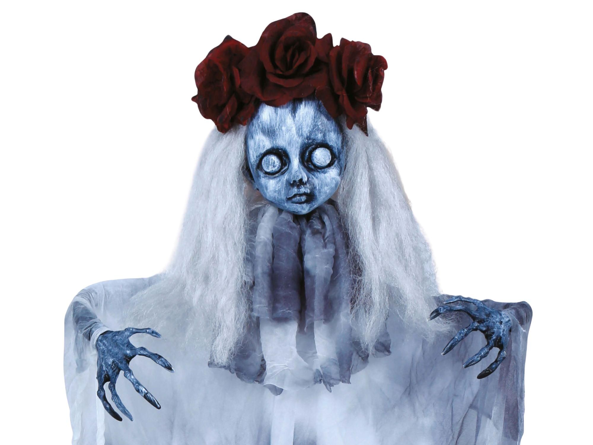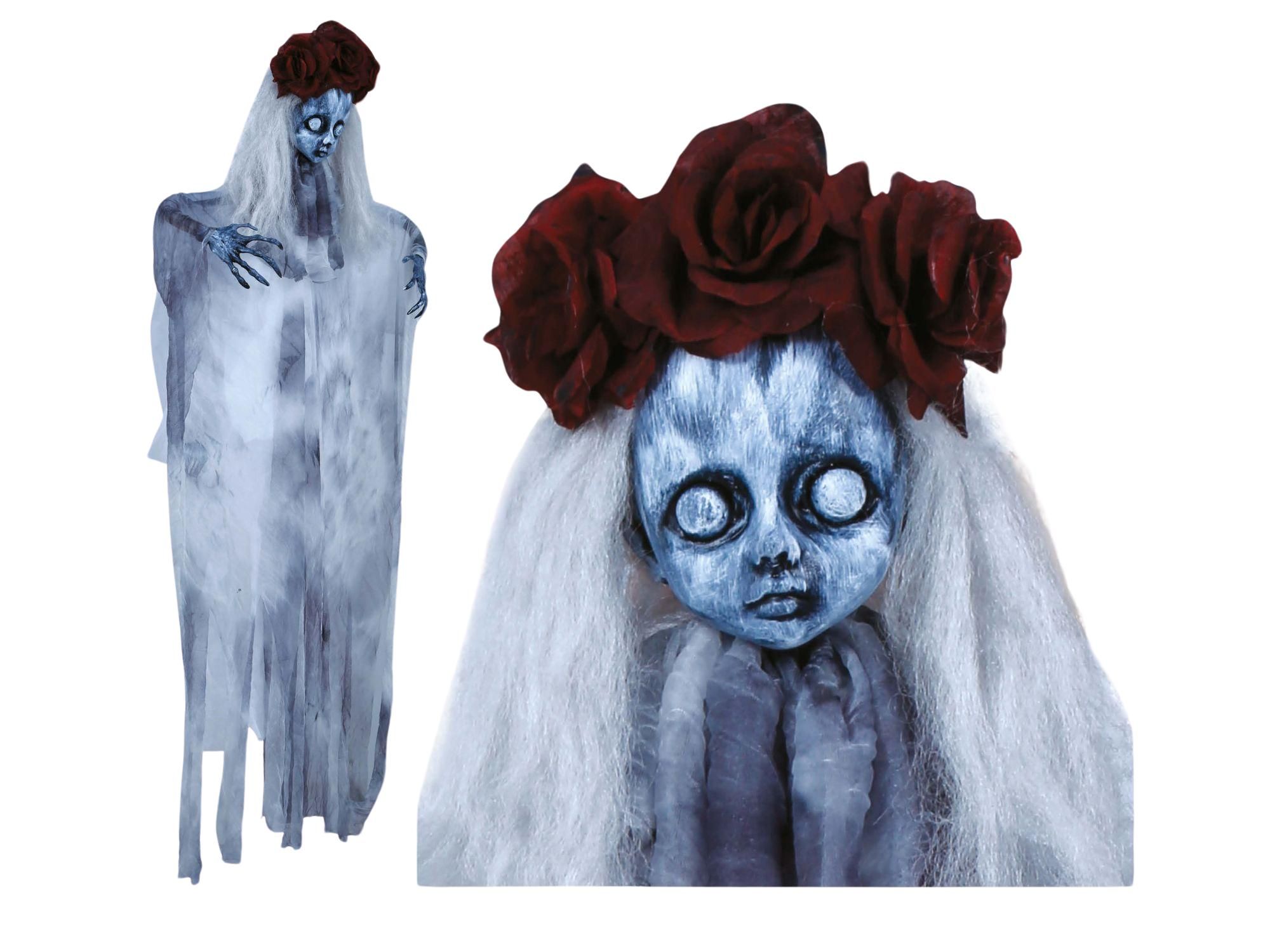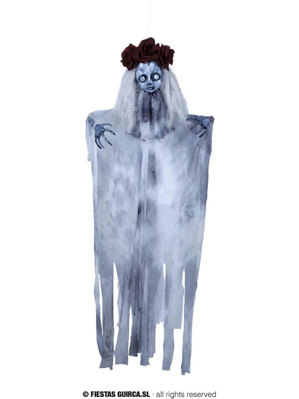 Decora la noche de Halloween con este original colgante de niña fantasma para Halloween. Ideal para que no te falte detalle en la noche de Halloween.