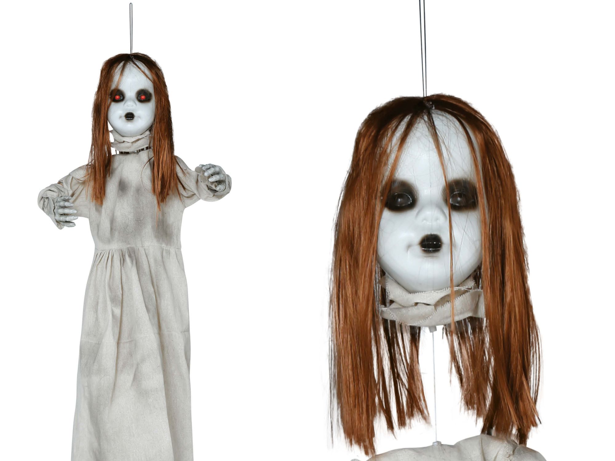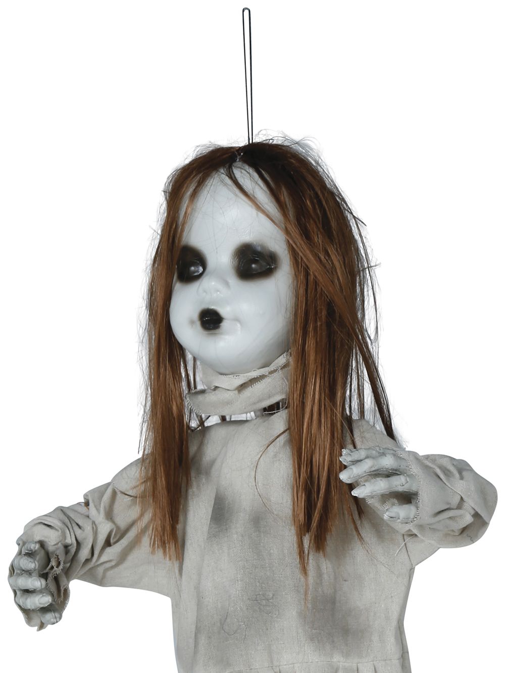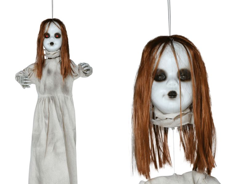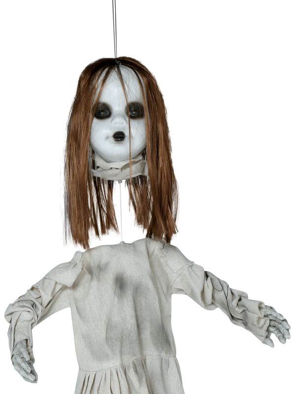 Decora el día de Halloween con este original colgante para la decoración del día de Halloween. Con este original colgante de niña poseída que baja y sube la cabeza. Tiene sonido y luz para dar un aspecto más terrorífico.