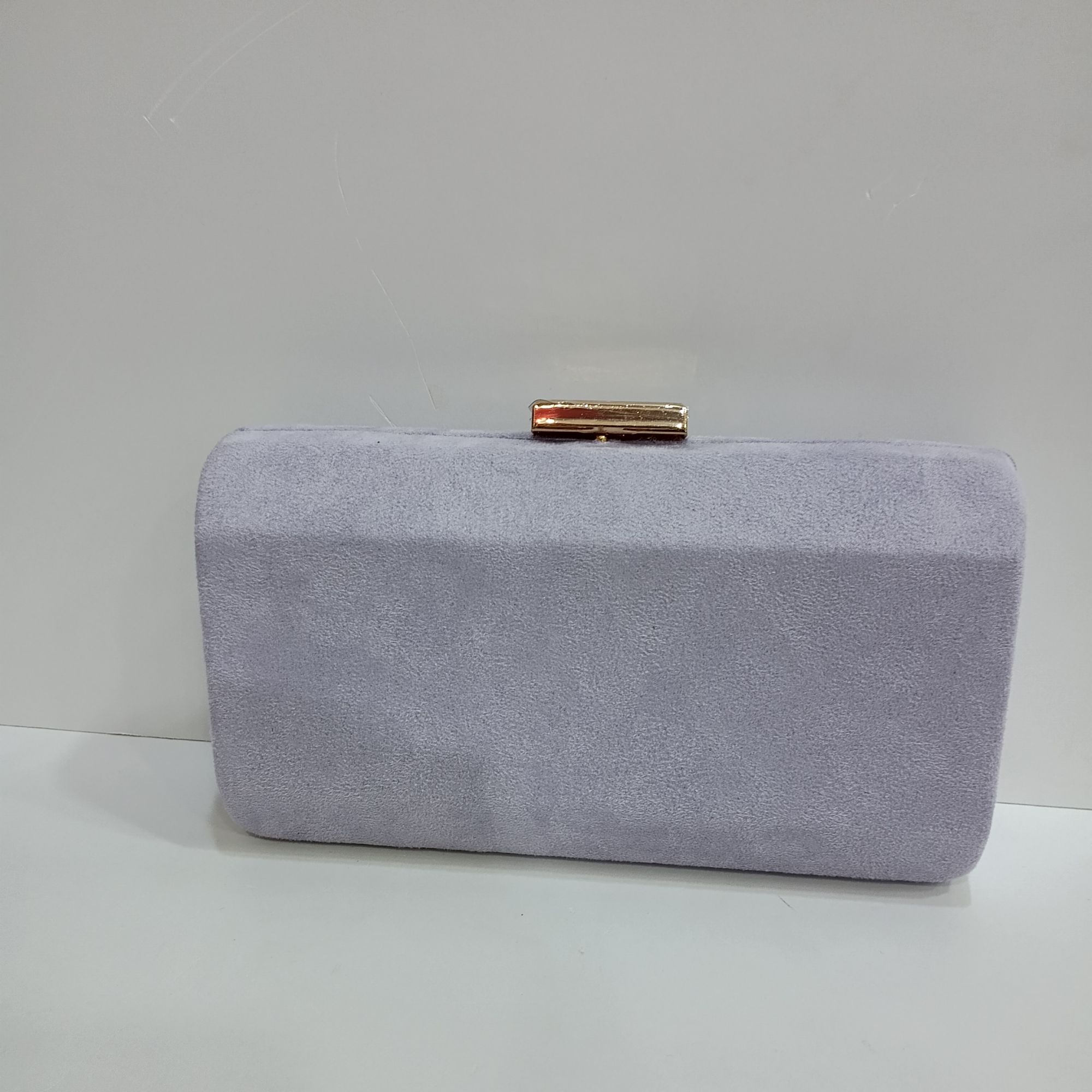 Bolso de boda de antelina color en lila , con broche y cadena dorada en el interior.