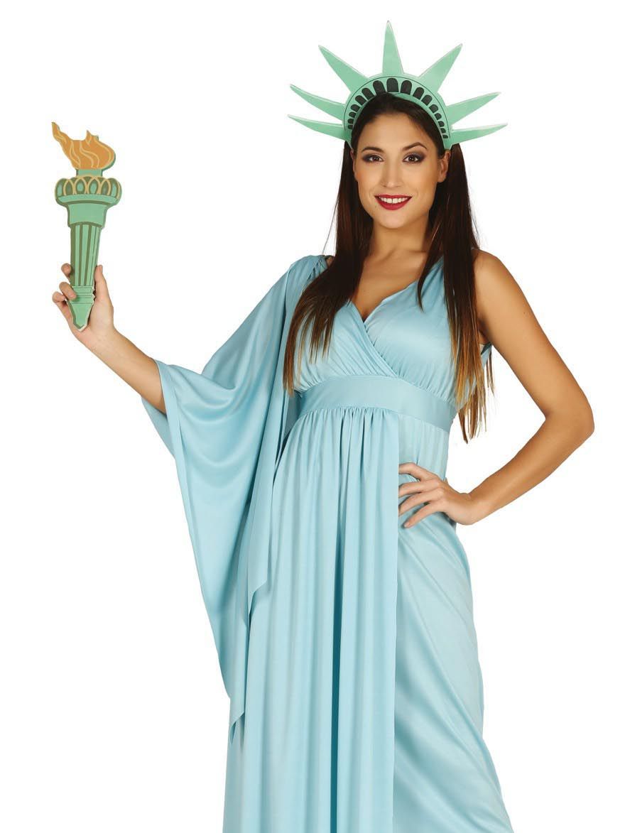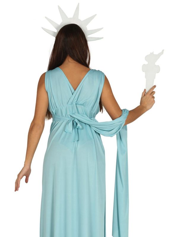 El disfraz de estatua contiene vestido, antorcha, capa y diadema.