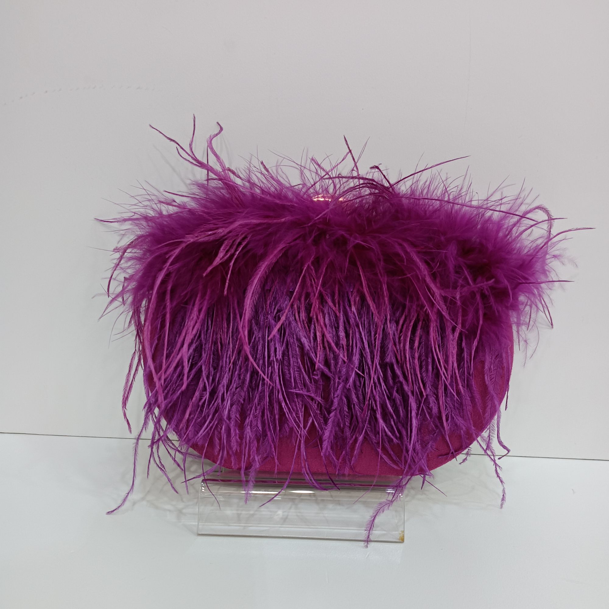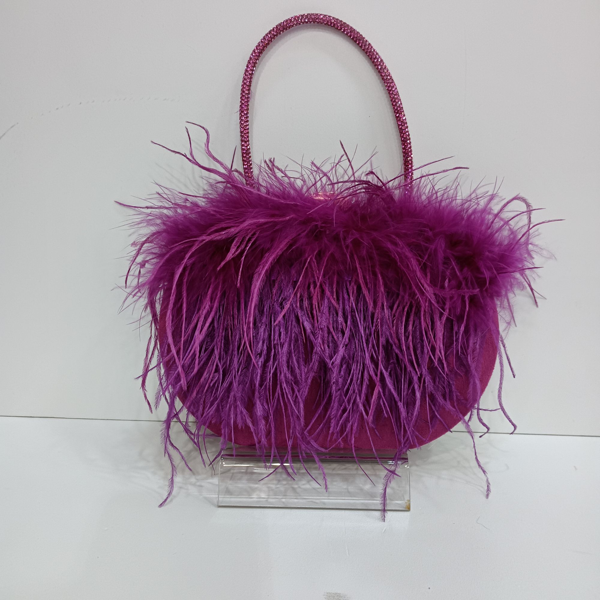 Bolso de fiesta de plumas en antelina con cierre de metal y un asa rigidaen el mismo color que el bolso . Cadena mas larga en el interior para colgar en el hombro. Quedara genial en tus looks de invitada.