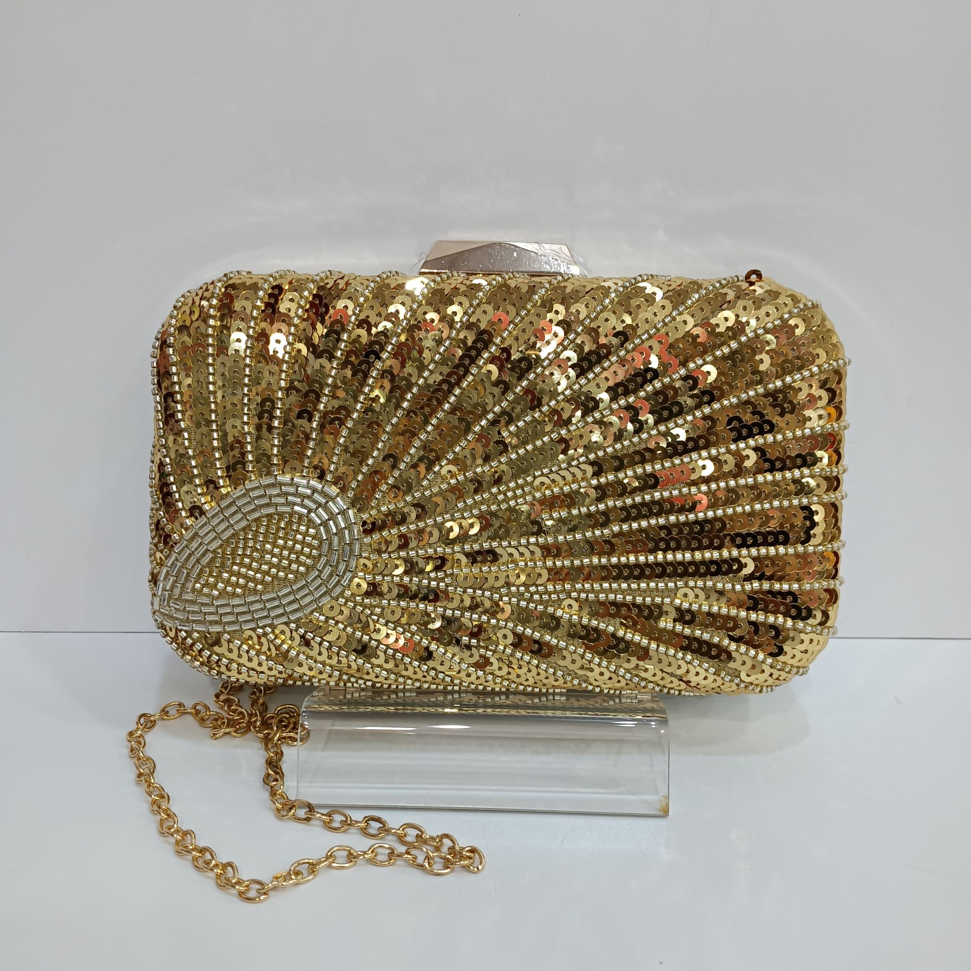 Bolso dorada de lentejuelas con cierre y cadena dorada en el interior.Dibujo por la parte delantera y por detras en dorada.