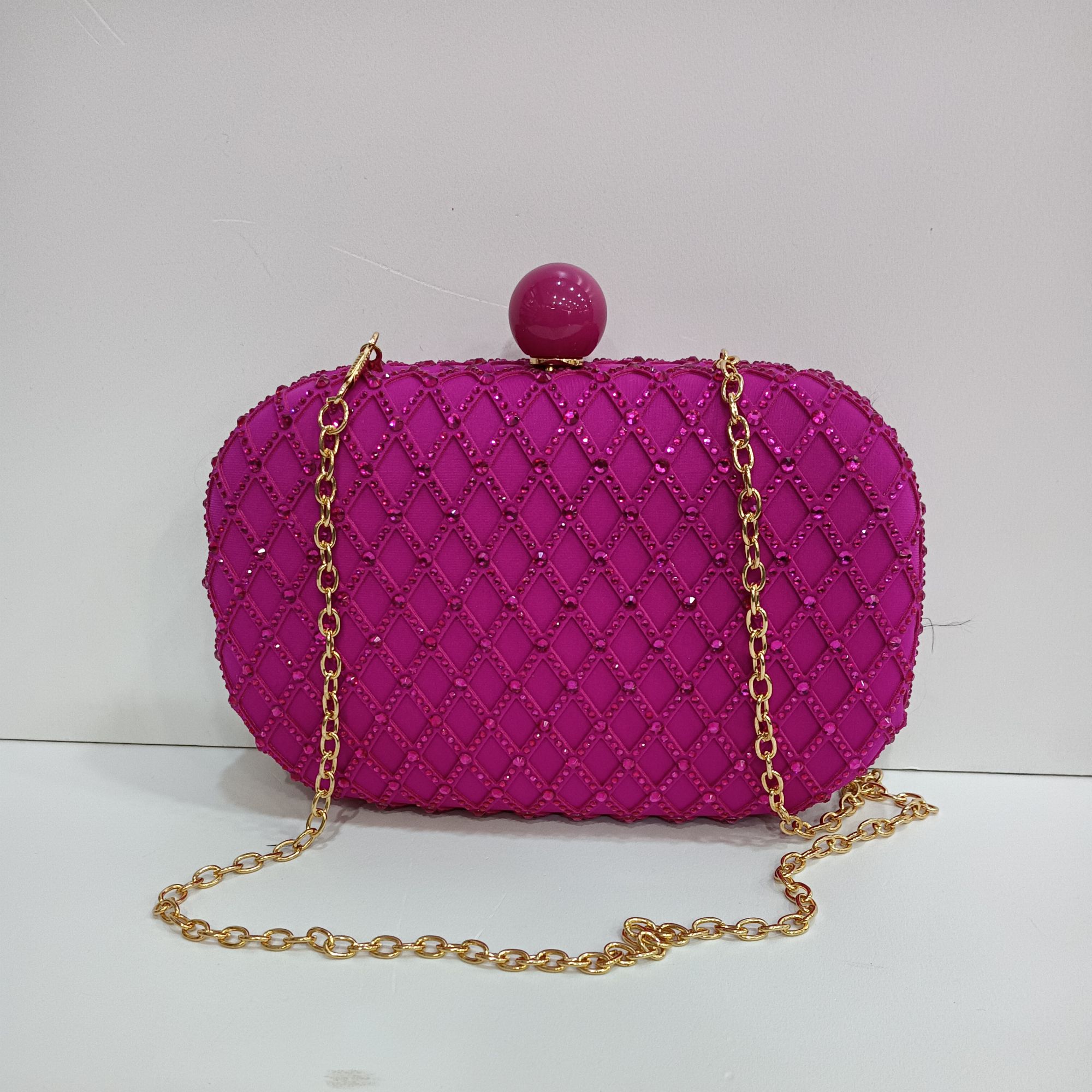Bolso fusia de fiesta o boda con dibujos en forma de rombo por los dos lados. Cierre en bola del mismo color y cadena dorada en el interior larga para el hombro .