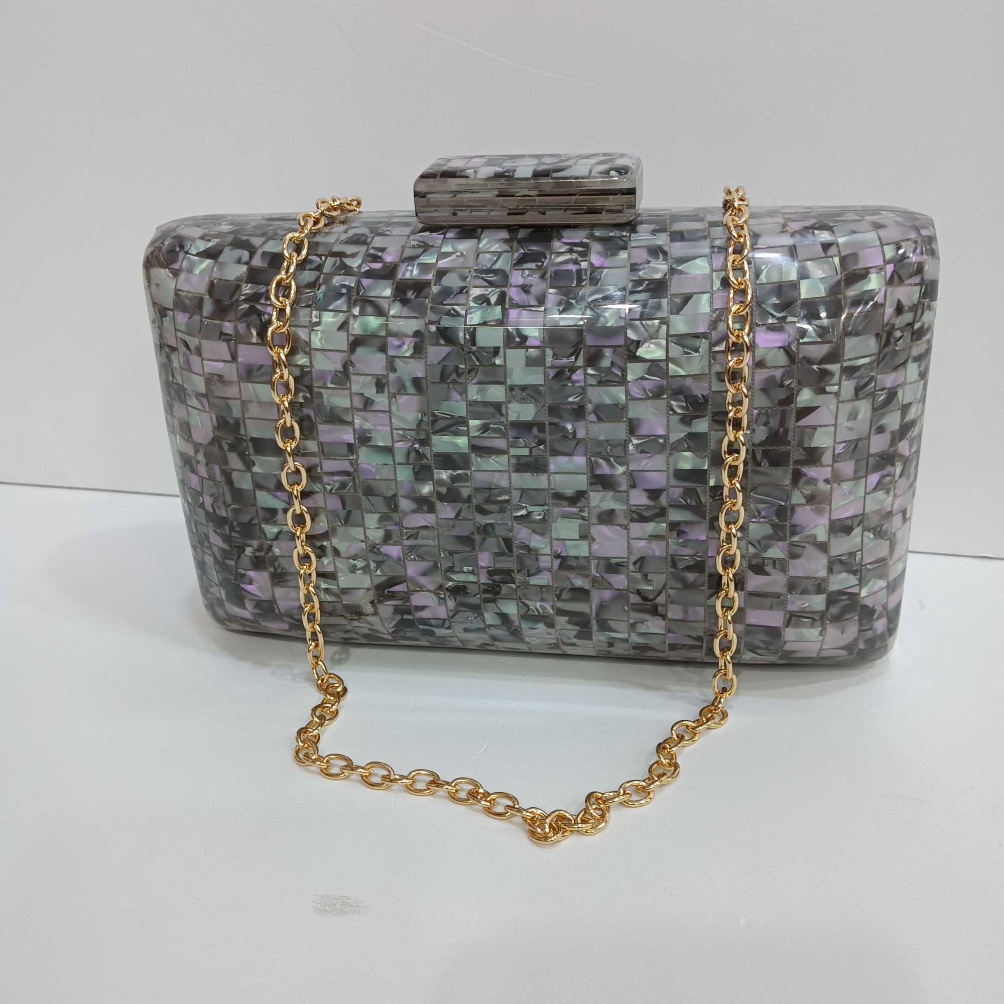 Bolso de boda en color gris con cuadritos en rosa y verde por las dos caras,el cierre del mismo color.Cadena dorada para el hombro en el interior genial para todos tus eventos.