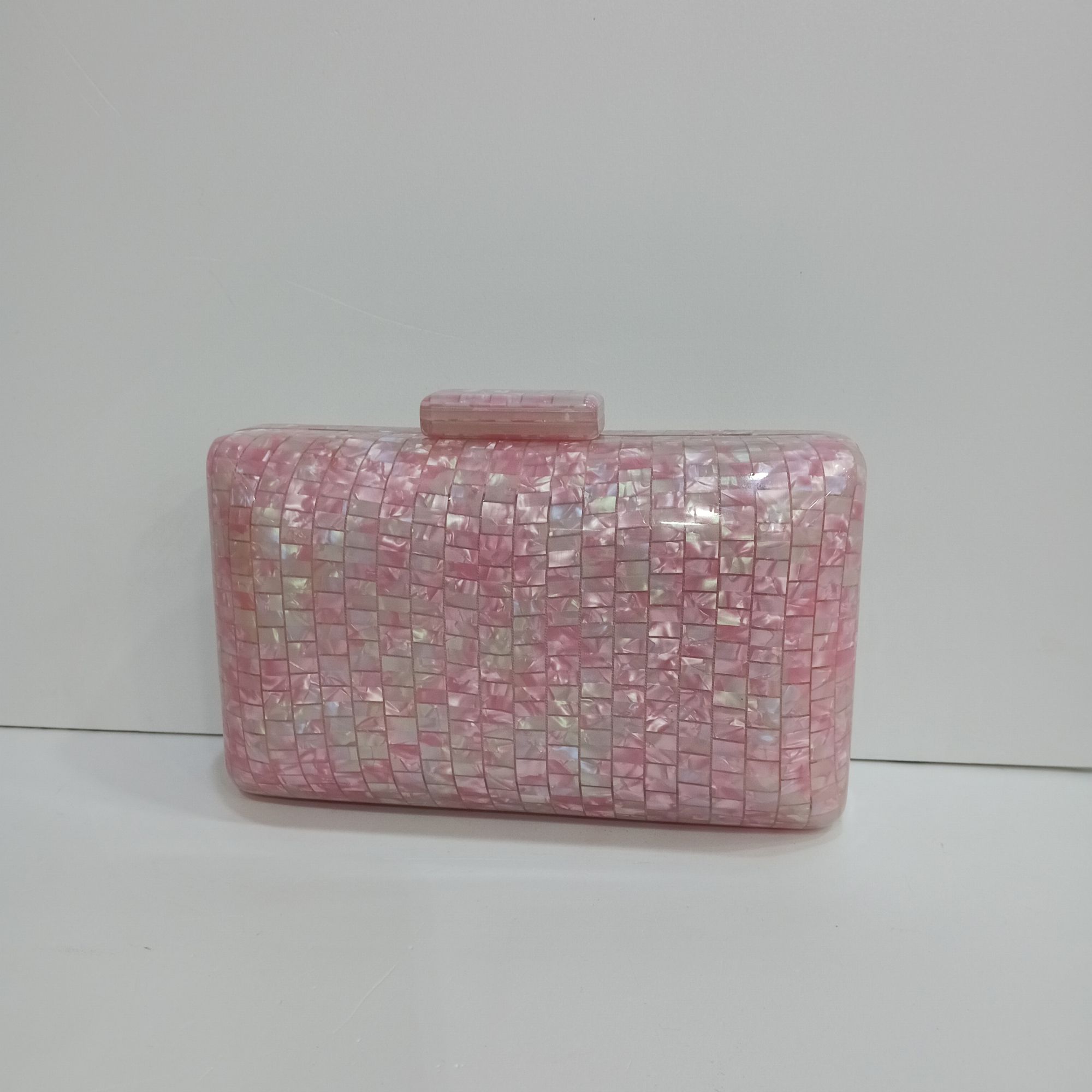 Bolso de concha rosa para fiestas ,con cierre de iman . Cadena larga para colgar en el hombro en color dorada.