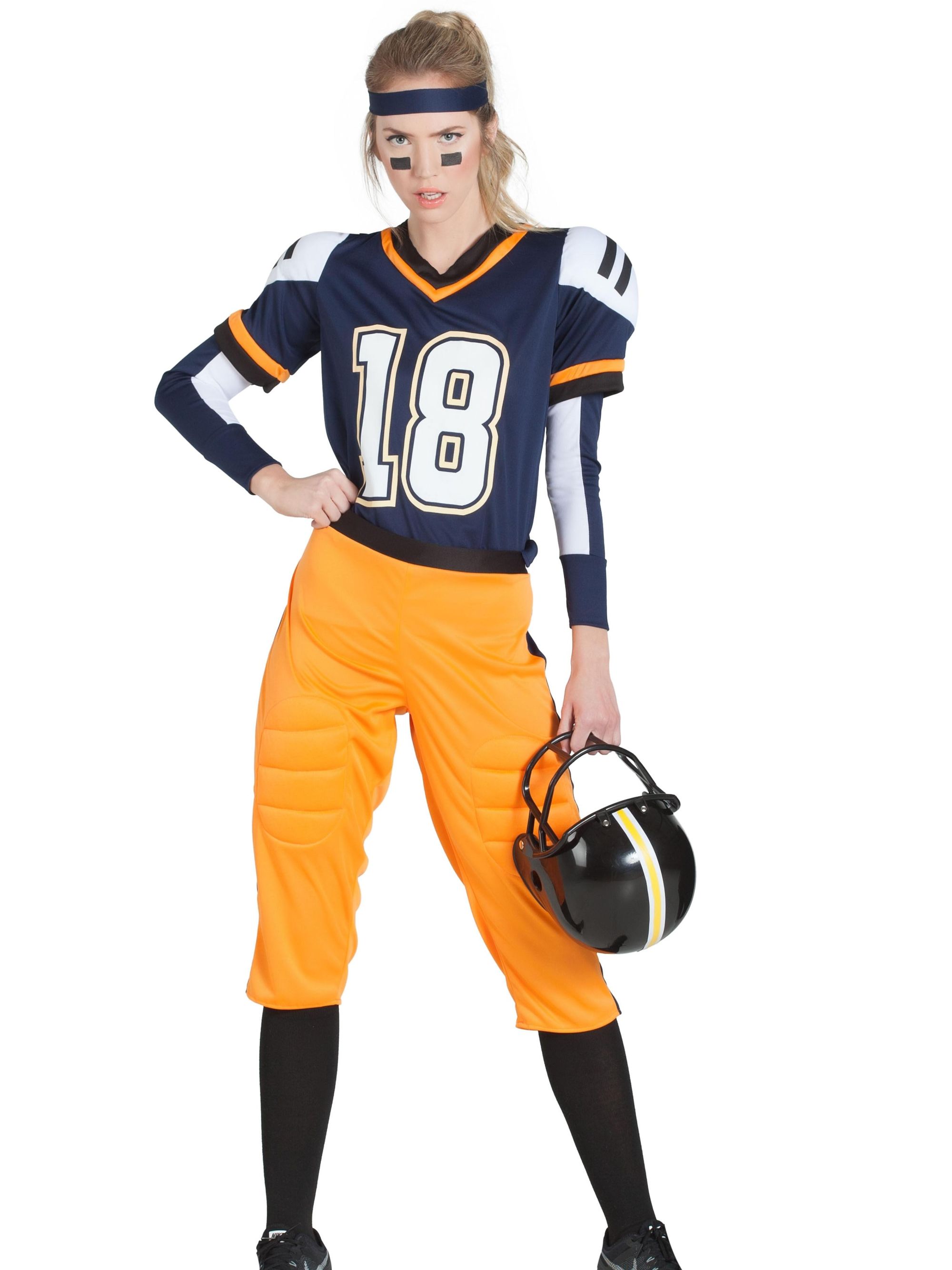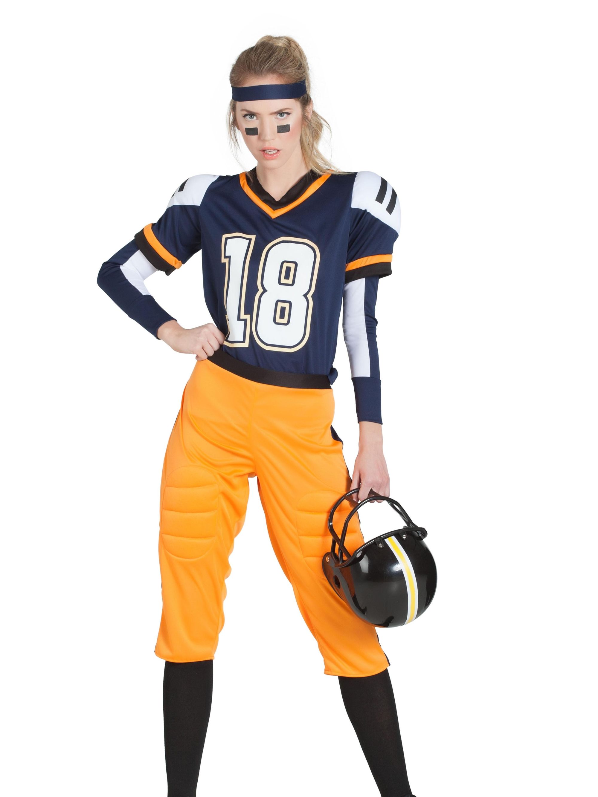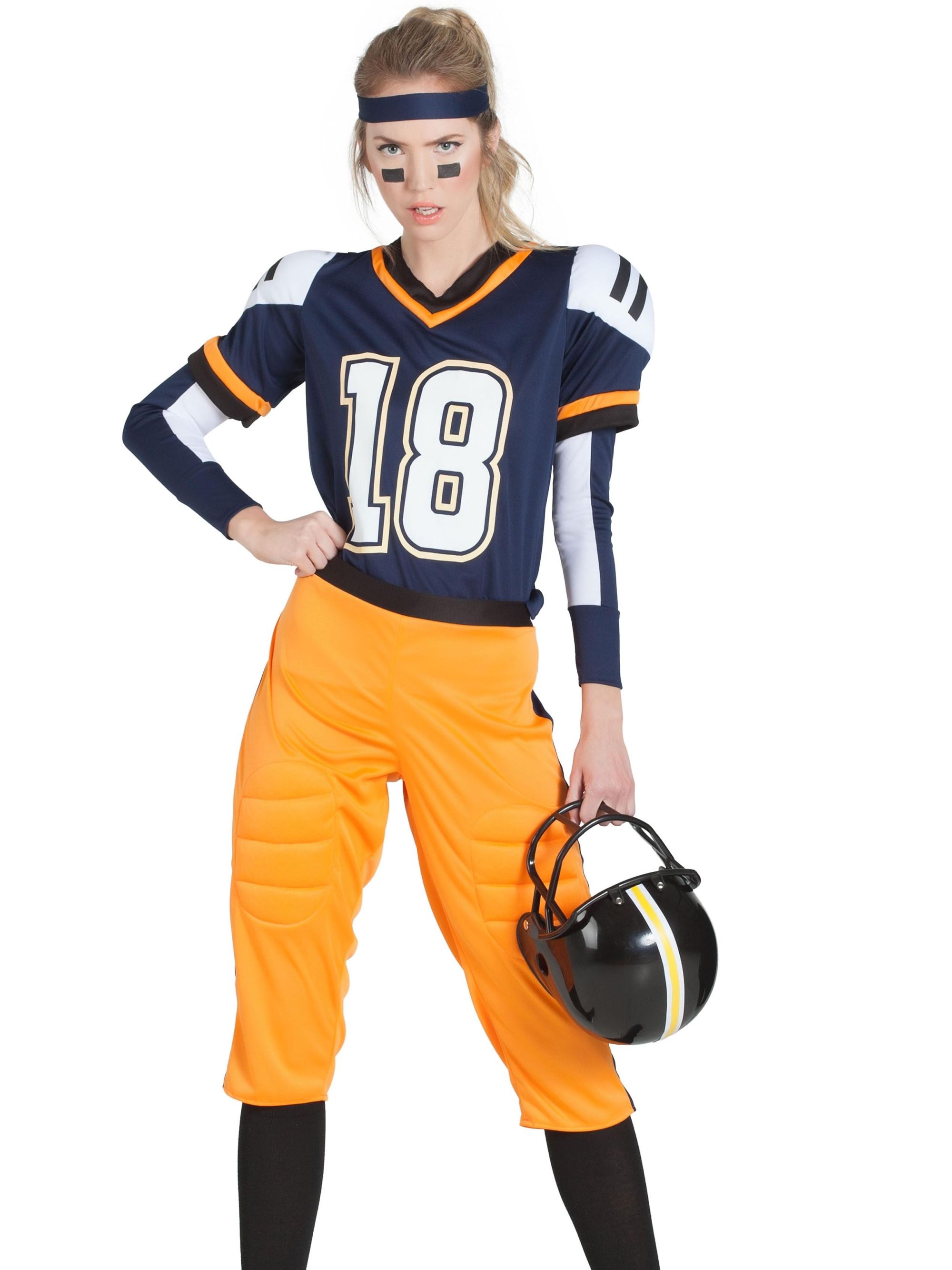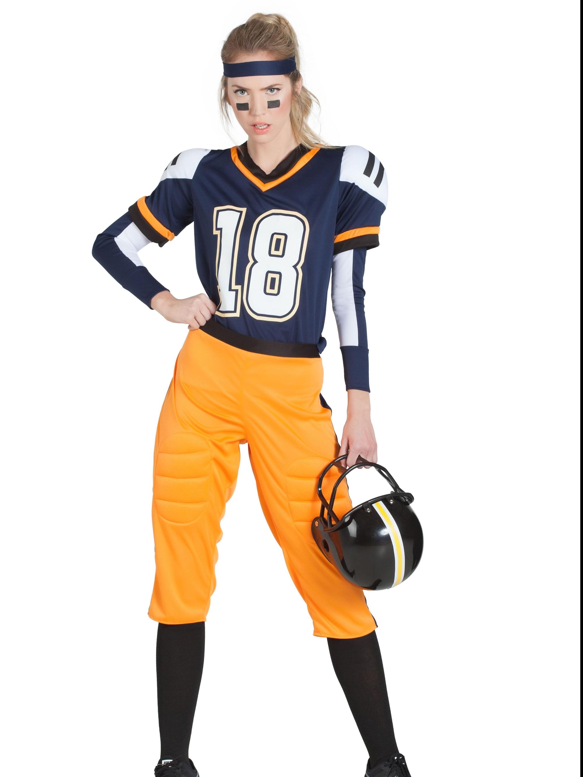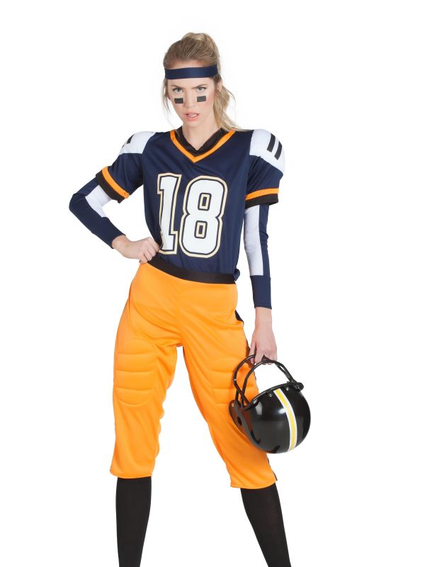 El disfraz de jugadora de rugby contiene cinta de la cabeza, camiseta con hombreras, mangas, pantalones y calcetas.